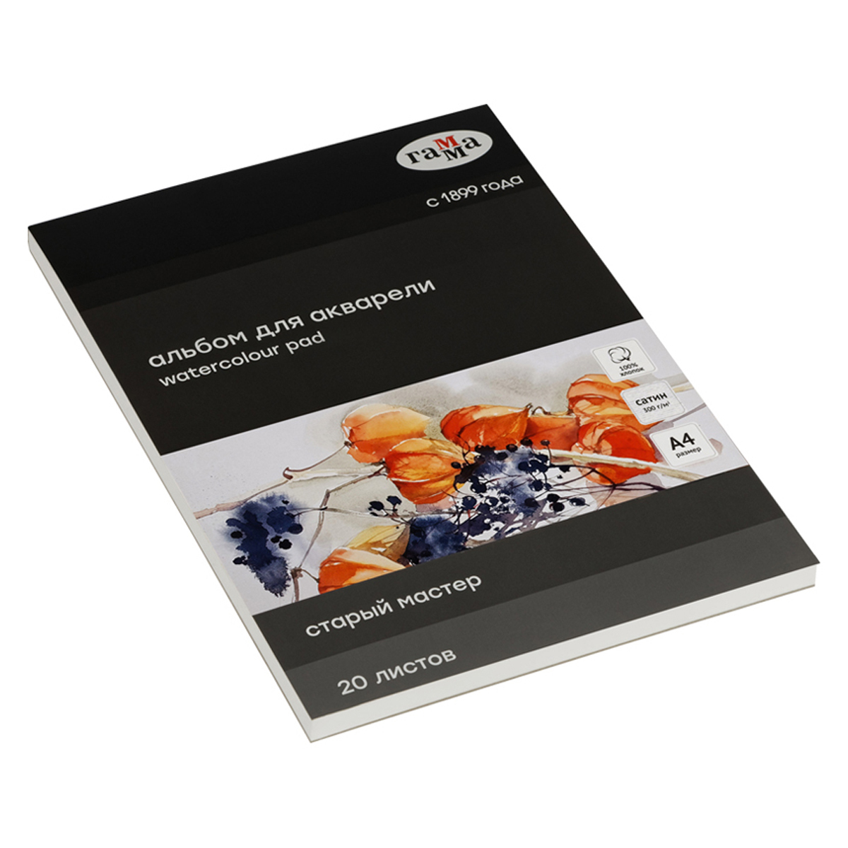 Альбом для акварели Гамма "Старый мастер" представлен в формате А4. Содержит 20 листов и имеет склейку с 4-х сторон, что позволяет использовать альбом как планшет. Бумага производится во Франции по традиционным технологиям из высококачественного 100% хлопка, плотность – 300 г/м. С одной стороны бумага имеет сатиновую (гладкую) структуру, с оборотной – матовая. Высокая плотность выдерживает больше воды и позволяет наносить больше краски. После высыхания бумага не деформируется. Акварельная бумага белого цвета изготовлена без использования кислот и отбеливателей. Альбом создан для акварельной живописи и позволяет работать в различных техниках.