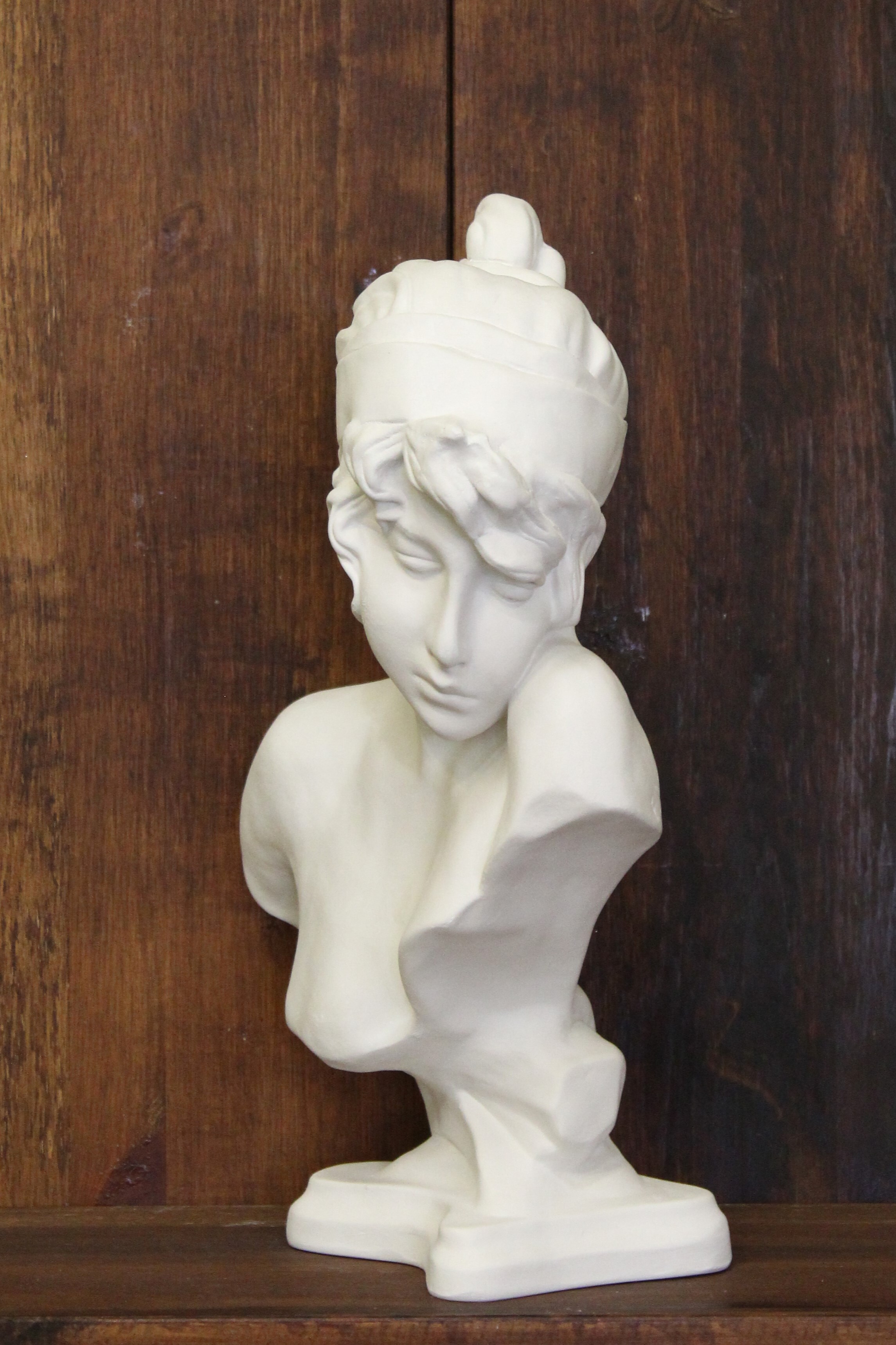 Древнегреческая поэтесса и музыкант Сафо, автор песенной лирики. В основе лирики Сафо лежат традиционные фольклорные элементы - мотивы любви и разлуки, действие происходит на фоне светлой и радостной природы. Одна из самых популярных позиций в ассортименте Мастерской Экорше, благодаря элегантности и пластичности формы. Сделана из гипса.
