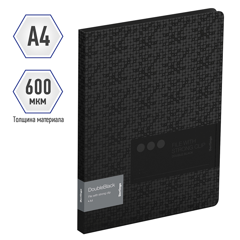 Стильная папка с боковым зажимом Berlingo серии DoubleBlack формата А4 отлично подходит для бережного хранения документов. Ширина корешка - 17 мм. Папка с зажимом вмещает до 300 листов. У изделия чёрная обложка с рельефным рисунком UV-лаком и чёрный цвет внутренней поверхности. Она изготовлена из высококачественного полипропилена с матовой текстурой поверхности "песок", на которой не видно отпечатков пальцев и мелких царапин. Толщина обложки составляет 0,6 мм. Металлический зажим чёрного цвета надёжно фиксирует документы, не повреждая их. На внутренней стороне обложки папка оснащена плотным прозрачным карманом для удобного хранения мелочей: ручки, заметок, визиток, дисков, флешек и др. Папка выполнена в размерах: 310*231*17 мм.