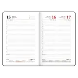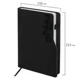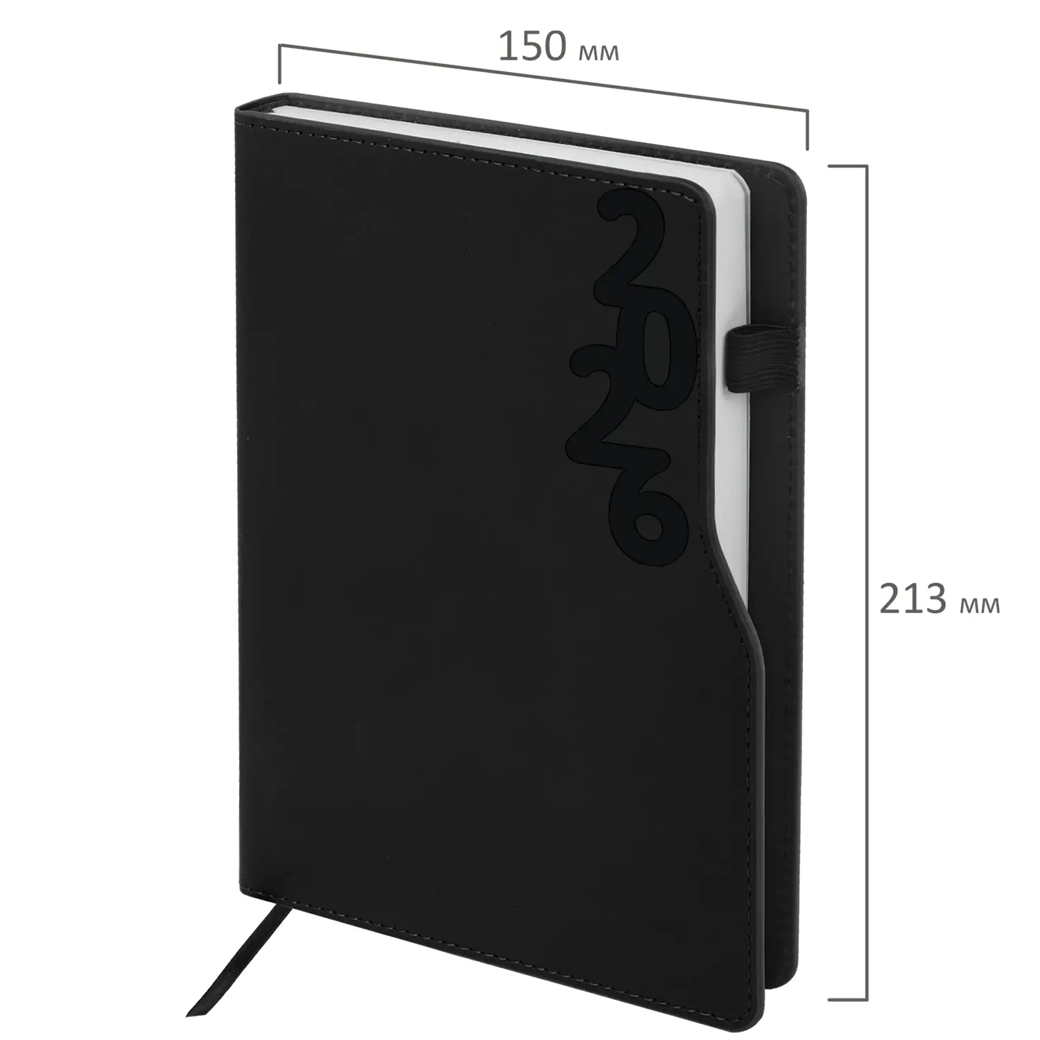 Датированный ежедневник BRAUBERG "Up" отличается оригинальным дизайном. Материал обложки "под кожу" с покрытием софт-тач делает ежедневник мягким, бархатистым, приятным на ощупь. Внутренний блок включает 168 листов белой бумаги плотностью 70 г/м2. Каждая страничка имеет перфорированный угол. Благодаря стандартному формату А5 (150х213 мм) ежедневник удобно использовать как в офисе, так и на выездных деловых встречах. Выполнен в классическом черном цвете. Жёсткая книжная обложка с прошивкой по периметру имеет текстуру гладкой кожи и подходит для горячего тиснения. Дополнениями являются закладка-ляссе, с помощью которой при необходимости можно быстро открыть ежедневник на нужной странице, и держатель для ручки. Обширный справочный материал дополнительно расширяет функциональность ежедневника. В конце внутреннего блока есть 4 страницы для записей и заметок.