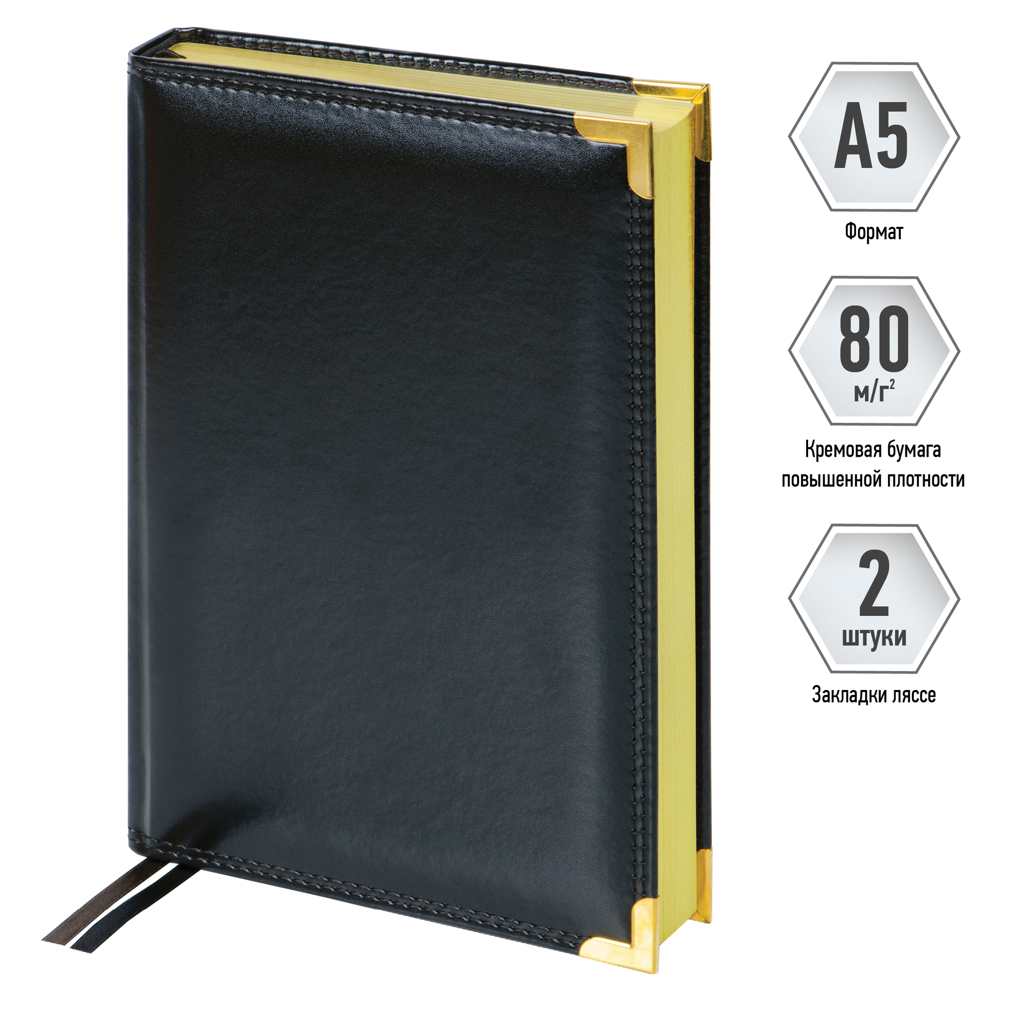 Недатированный ежедневник выполнен из премиальной гладкой экокожи, имитирующей кожу первоклассной выделки с поролоновой прослойкой, и прошита двойной строчкой. Идеально подойдет для создания современного стильного имиджа. Внутренний блок включает 160 листов высококачественной кремовой бумаги повышенной плотности 80 г/м2 с пантонной печатью блока в 2 краски. Каждая страничка имеет перфорированный угол. Золотые металлические уголки и золотой срез придают ежедневнику особый шарм. Компактный размер A5 (150*215 мм) позволит легко взять его с собой куда бы вы ни отправились. Справочный материал, 2 удобных закладки-ляссе, отрывные заметки, бланки-извещения о ДТП и вырубной блок по неделям обеспечат комфорт при использовании ежедневника. Изделие подходит под персонализацию. Упаковано в подарочную матовую индивидуальную упаковку. В подарок 3 комплекта стикеров.