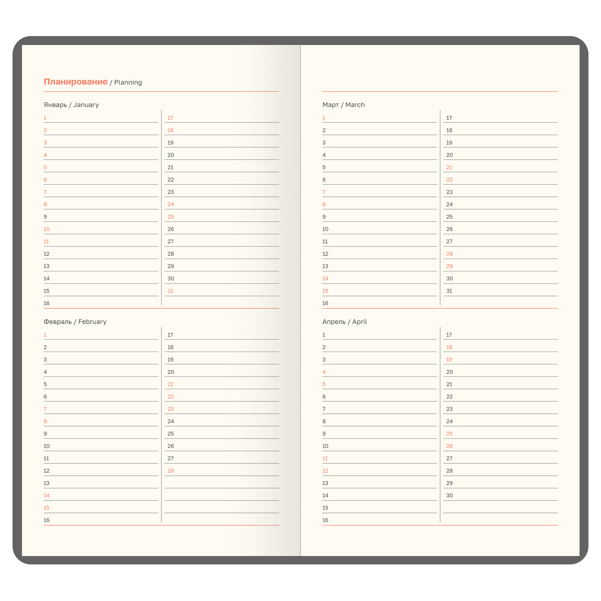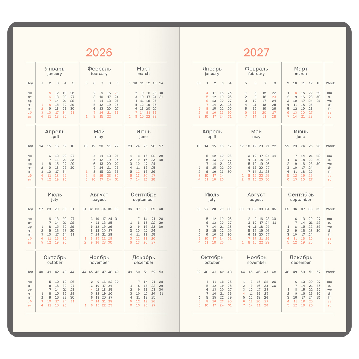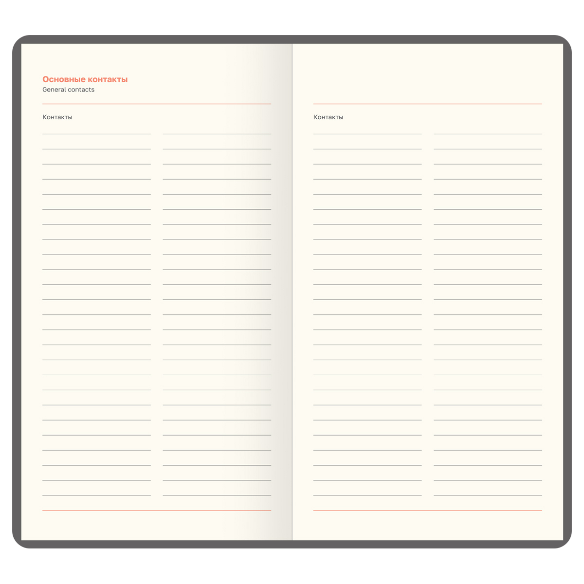Планирование недели становится проще, когда вся информация доступна на одном развороте. Элегантная закладка обеспечивает быстрый доступ к нужной странице. Содержит календарь на 2 года, листы для записи контактов, заметок и зарисовок. Индивидуальная упаковка гарантирует его сохранность.