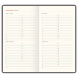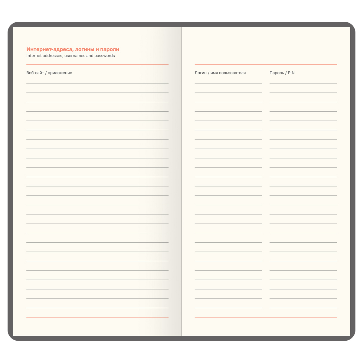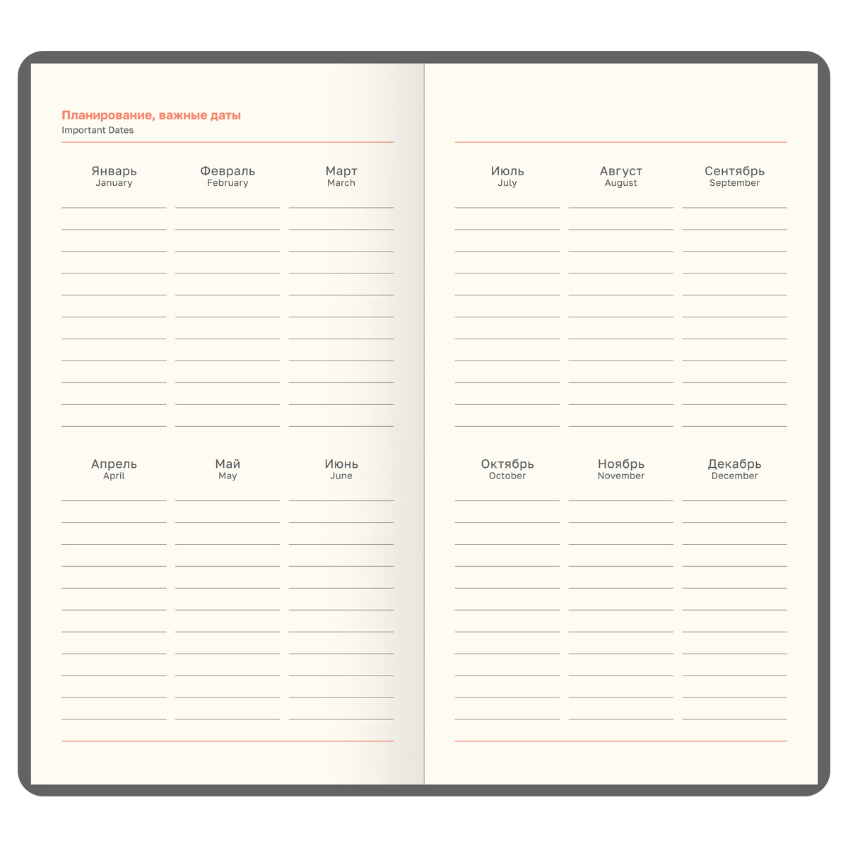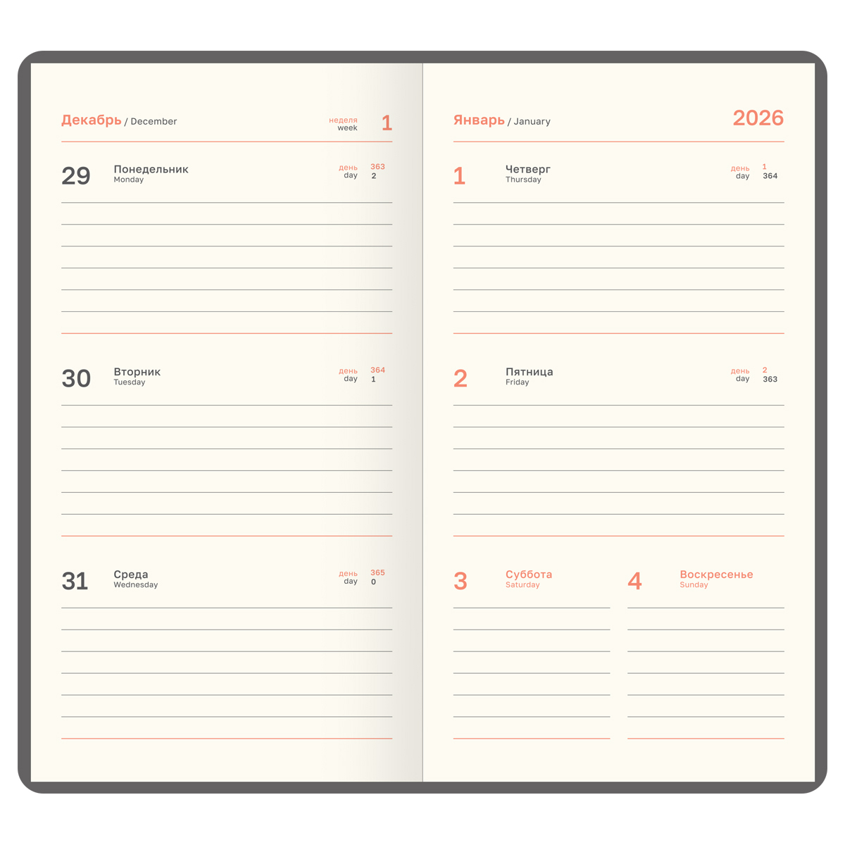 Планирование недели становится проще, когда вся информация доступна на одном развороте. Элегантная закладка обеспечивает быстрый доступ к нужной странице. Содержит календарь на 2 года, листы для записи контактов, заметок и зарисовок. Индивидуальная упаковка гарантирует его сохранность.