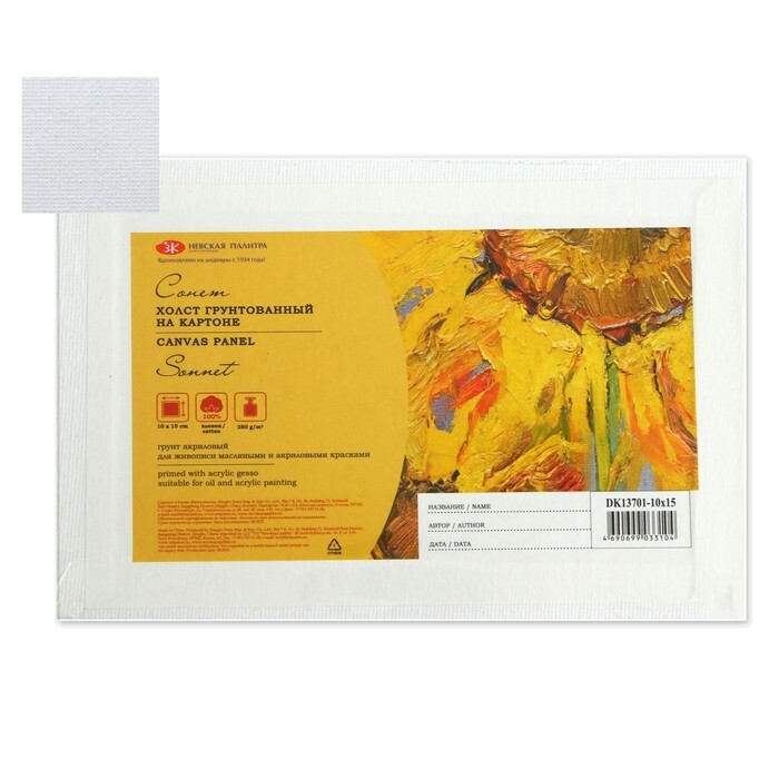 Холст прясоугольной формы плотностью 280 г/м2, размер – 10х15см. Материал: 100% хлопок, картон, акриловый грунт.