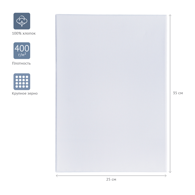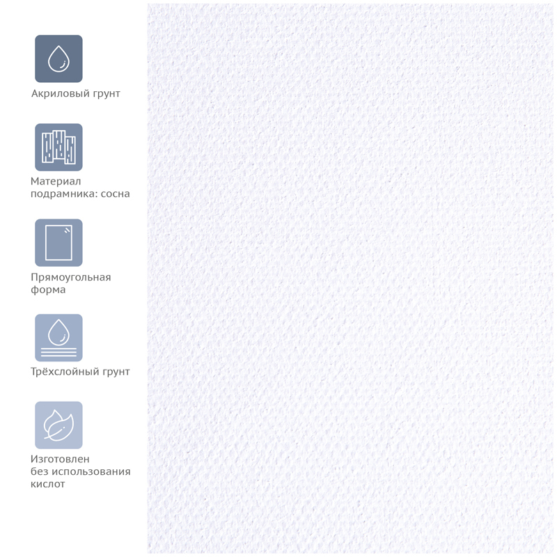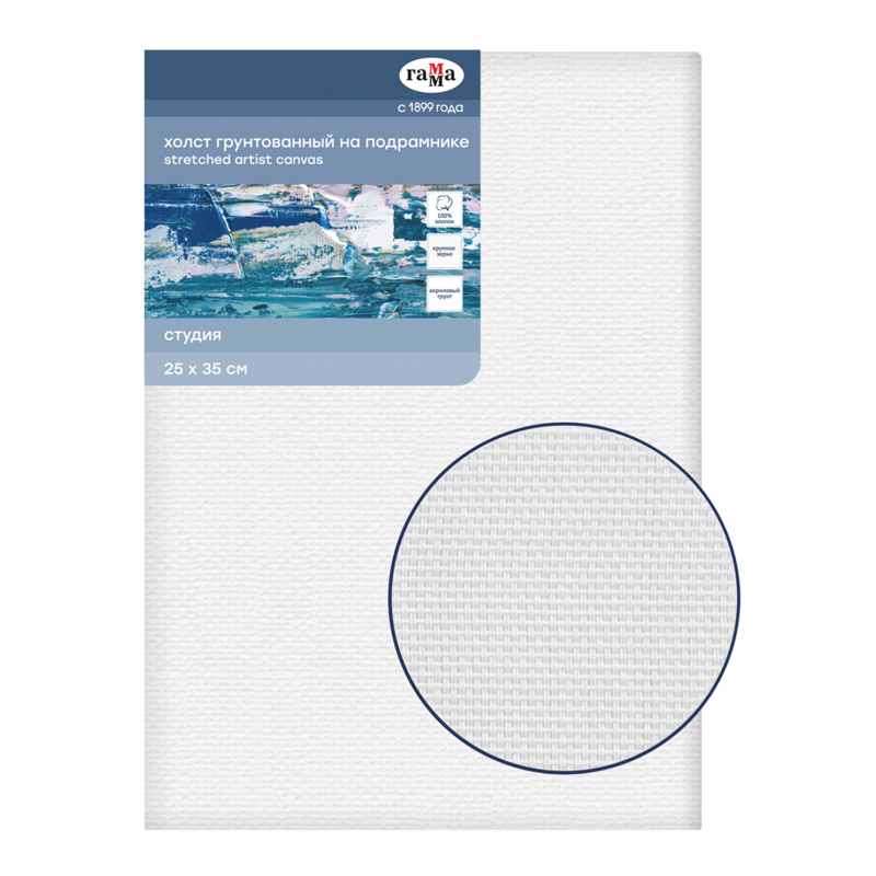 Холст из 100% хлопка для живописи масляными, акриловыми и темперными красками. Трехслойный акриловый грунт сохраняет чистоту цветов и оттенков. Плотность 400 г?/?м² подходит для создания картин в пастозной технике. Подрамник из натуральной сосны, клинья для натяжения холста в наборе. Крупное зерно.