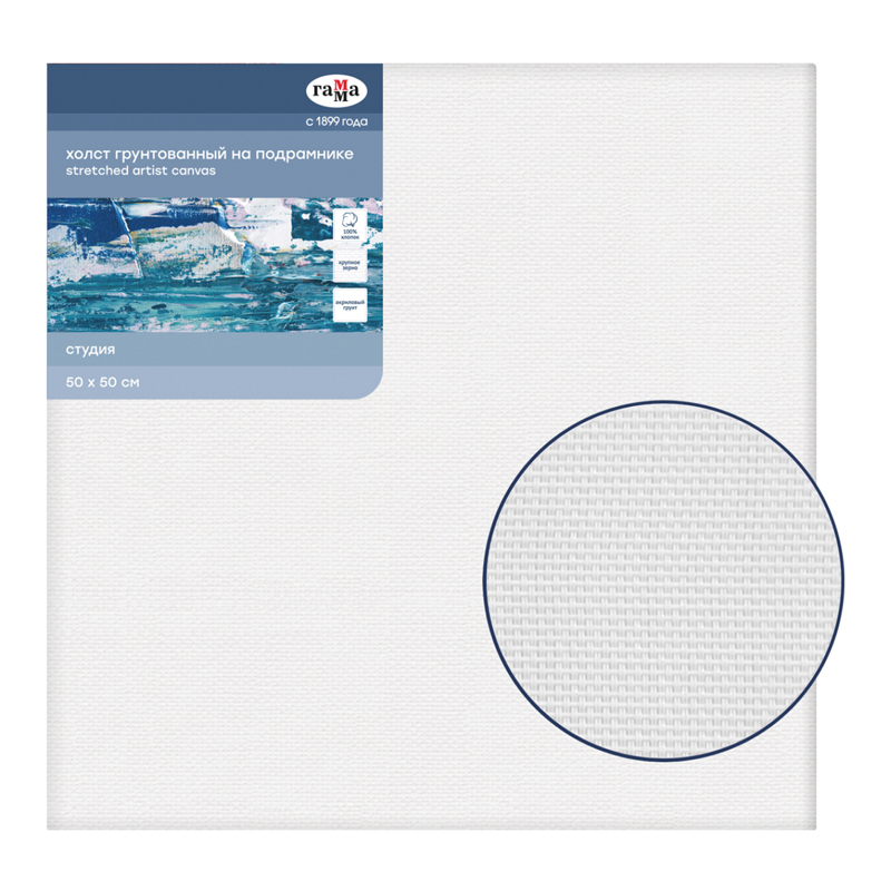 Холст прямоугольной формы плотностью 400 г/м2, размер – 50х50 см. Материал: 100% хлопок, картон, трехслойный акриловый грунт, который не склонен к потрескиванию.