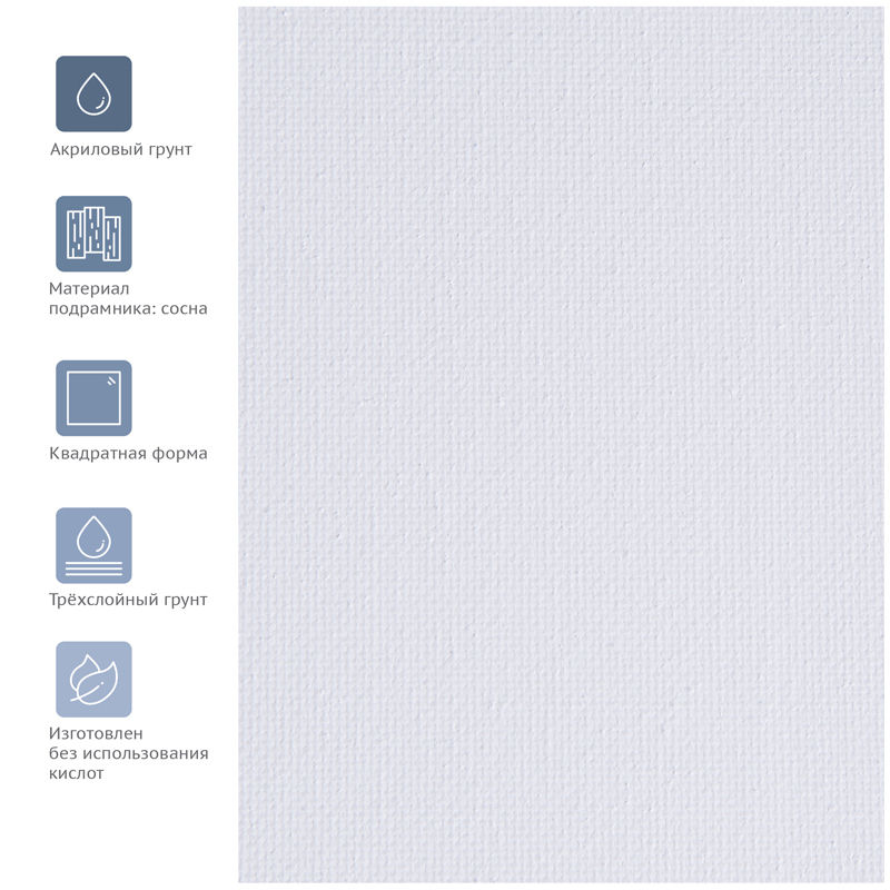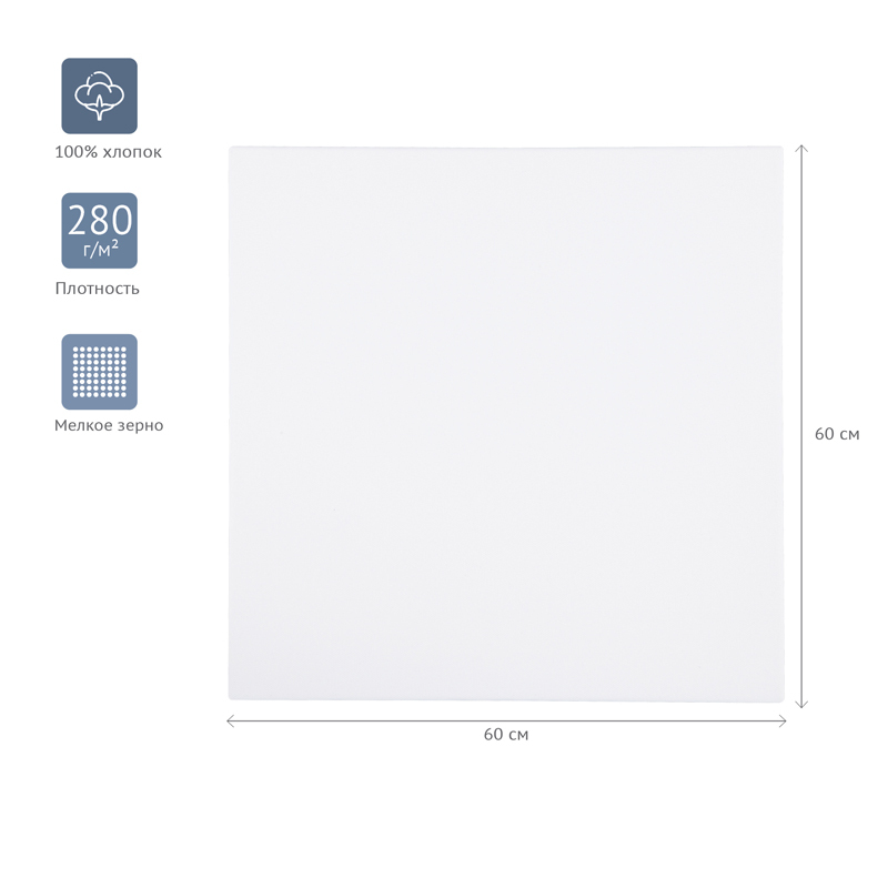 Хлопковый холст на подрамнике ГАММА серии «Студия», грунтованный, подойдёт для живописи масляными, акриловыми, темперными и гуашевыми красками. Основа – натуральное полотно, 100% хлопок, мелкое зерно. Холст квадратной формы плотностью 280 г/м2, размер – 60*60 см. Холст покрыт акриловым грунтом, а подрамник выполнен из сосны. Изготовлен без использования кислот.