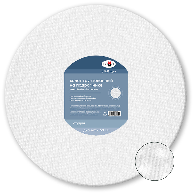 Холст на подрамнике круглой формы «Гамма» серии «Студия» выполнен из натурального полотна – 100% российский хлопок, среднее зерно, акриловая грунтовка. Изделие круглой формы имеет диаметр 60 см. Трехслойный акриловый грунт сохраняет чистоту цветов и оттенков. Холст – идеальная основа для работы масляными, акриловыми и темперными красками. Подрамник изготовлен из МДФ с буртиком. Изделие идеально подойдет студентам художественных школ и училищ, начинающим и профессиональным художникам. Изделие упаковано в термоусадочную пленку, предохраняющую его от вредных воздействий внешней среды.