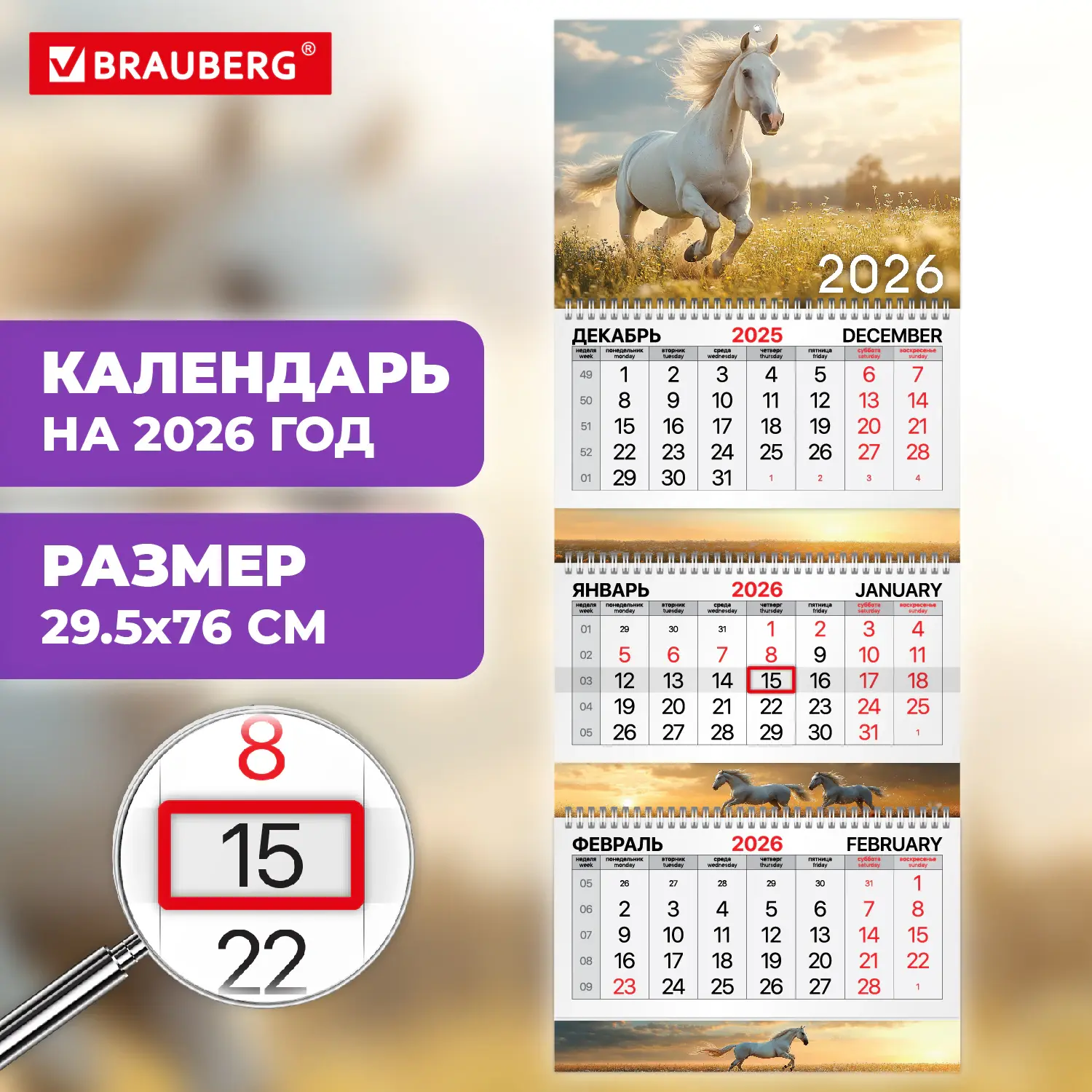 Квартальный календарь BRAUBERG EXTRA "Символ 2026" предназначен для делового планирования. Офисный календарь на 2026 год на 3 гребнях. Для удобства планирования состоит из 3 блоков с календарными сетками на три месяца – предыдущий, текущий и следующий. Курсор-бегунок выделяет текущую дату. Блок календаря напечатан на мелованной бумаге плотностью 80 г/м2. Подложка изготовлена из мелованного картона плотностью 250 г/м2. Вертикальное расположение. Размер – 29,5х76 см.