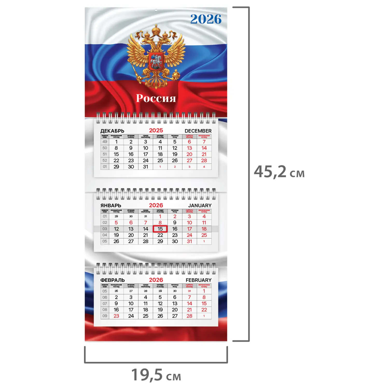 Квартальный календарь BRAUBERG EXTRA MINI "Символика" предназначен для делового планирования. Офисный календарь на 2026 год на 3 гребнях. Для удобства планирования состоит из 3 блоков с календарными сетками на три месяца – предыдущий, текущий и следующий. Курсор-бегунок выделяет текущую дату. Блок календаря напечатан на мелованной бумаге плотностью 75 г/м2. Подложка изготовлена из мелованного картона плотностью 250 г/м2. Вертикальное расположение. Размер – 19,5х45,2 см.