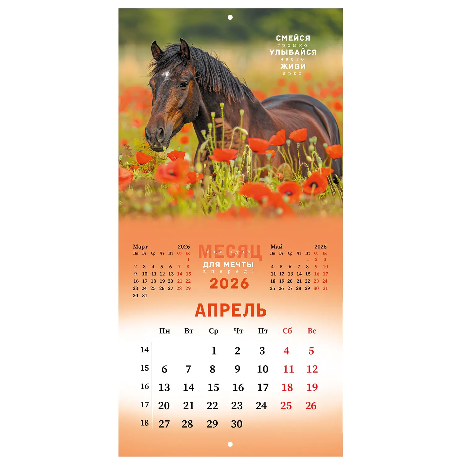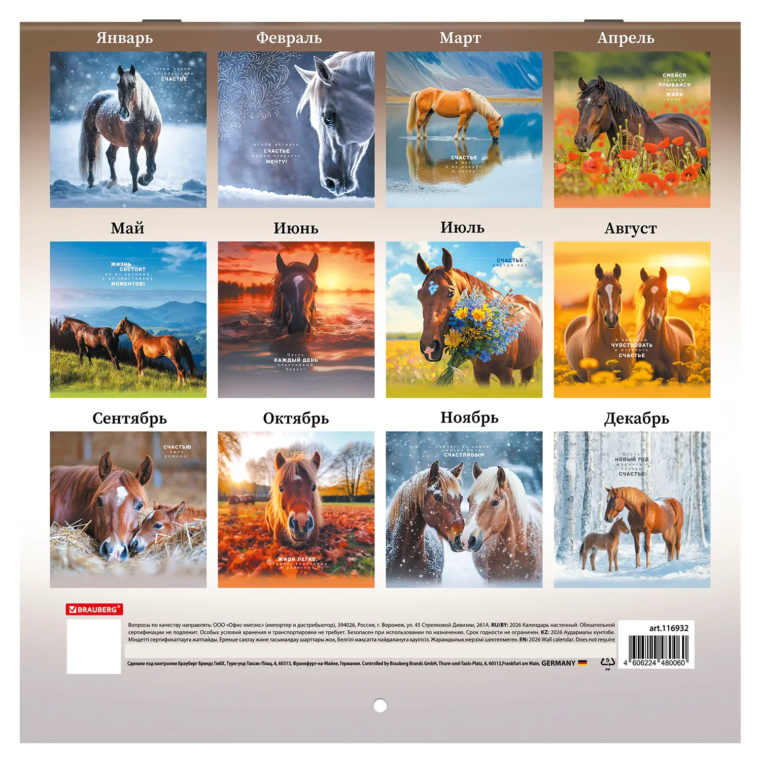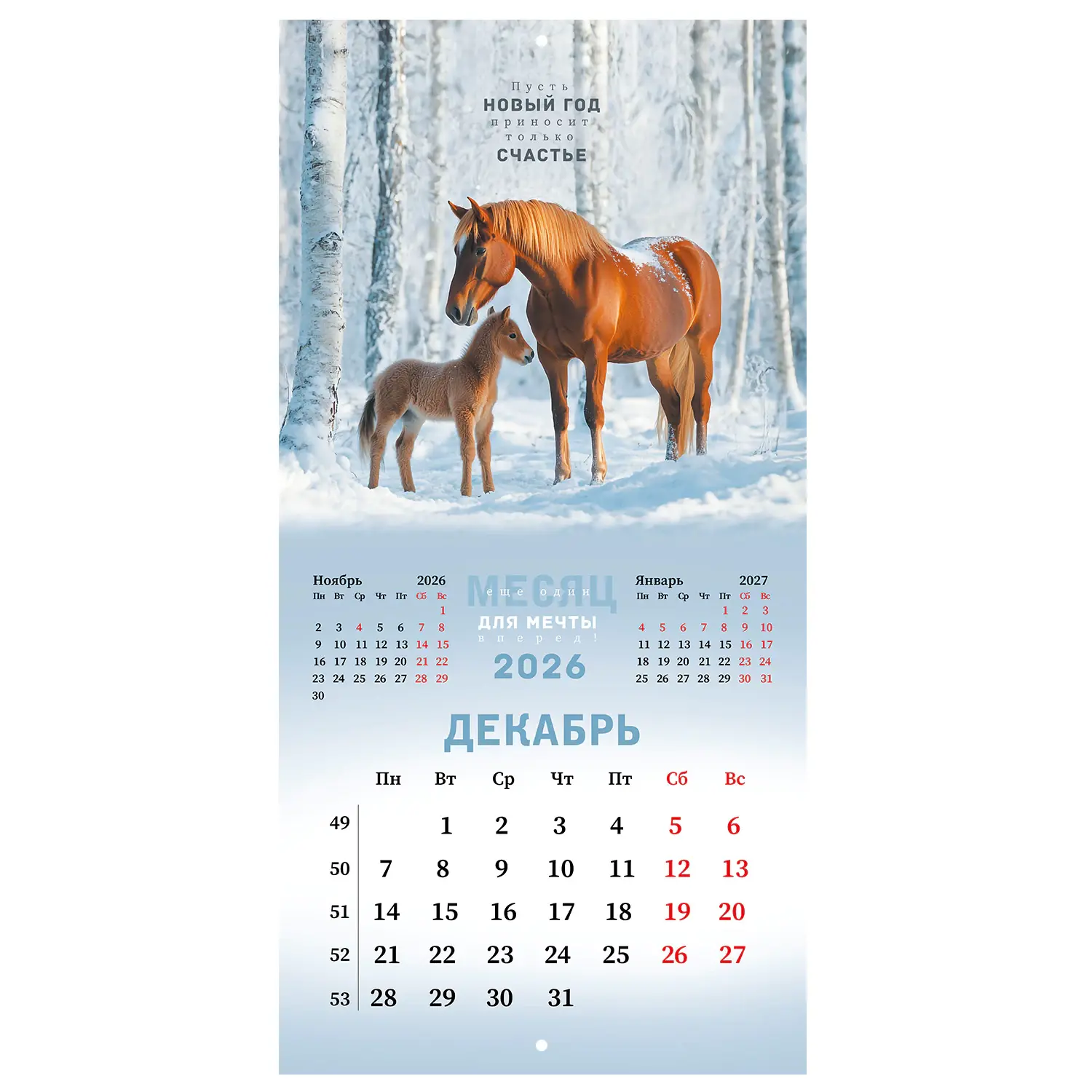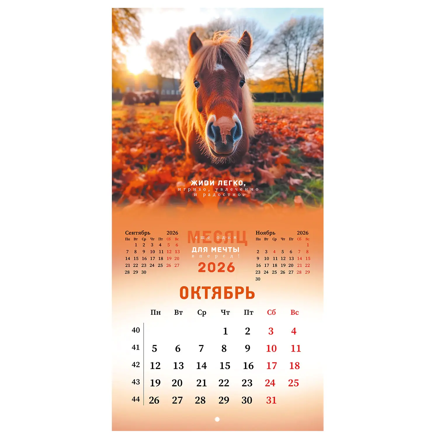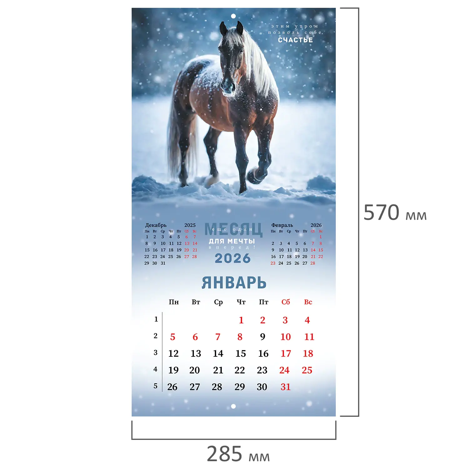 Яркая, красочная картинка дополнена календарной сеткой на месяц. Содержит 12 листов. Блок календаря напечатан на мелованной бумаге плотностью 130 г/м2. Оригинальная обложка изготовлена из мелованной бумаги плотностью 230 г/м2. Размер – 28,5х28,5 см, в развороте – 28,5х57 см. Дополнен отверстием для удобства крепления. Поставляется в индивидуальной упаковке (полибэг) с европодвесом и прокладкой из гофрокартона, что создает товару дополнительную защиту.