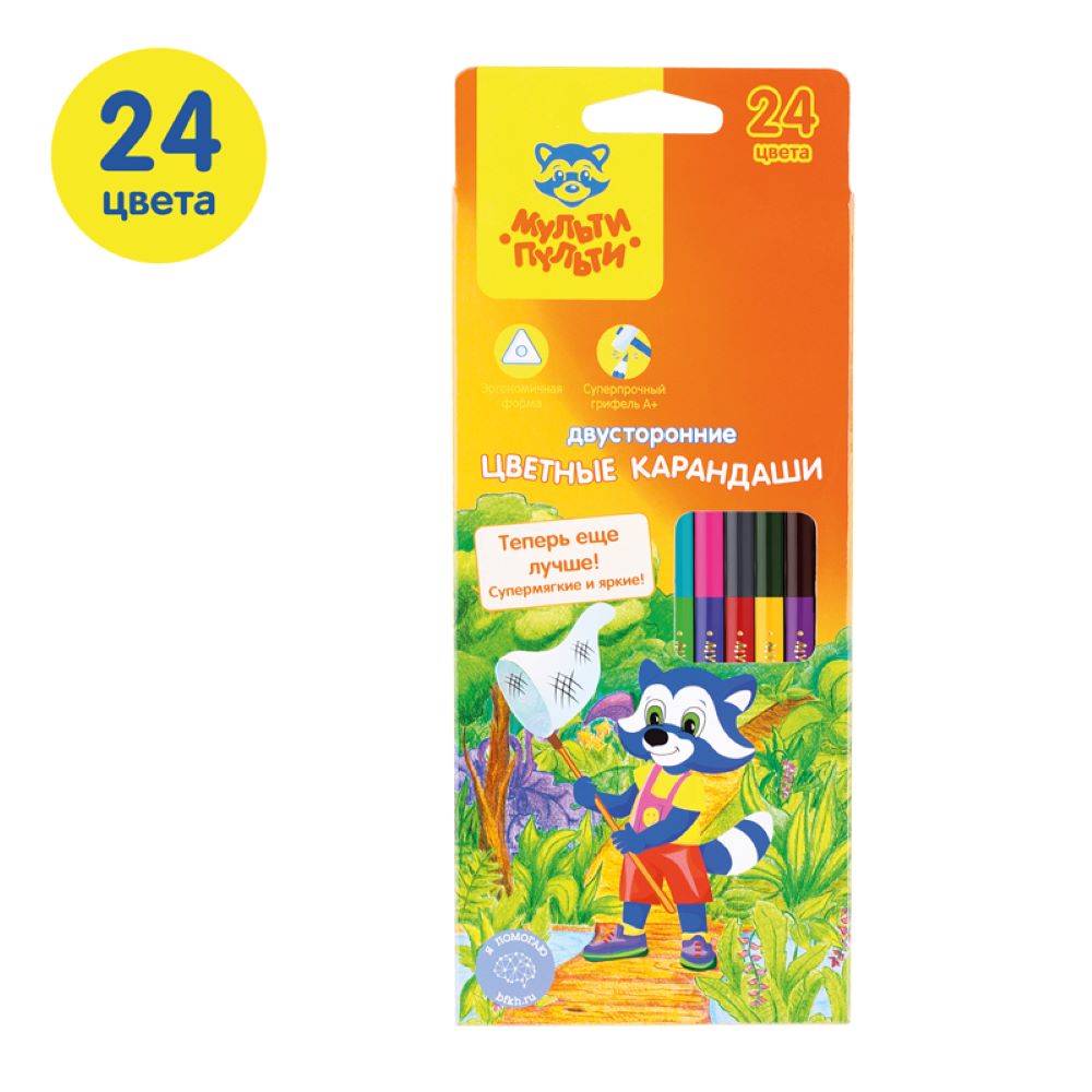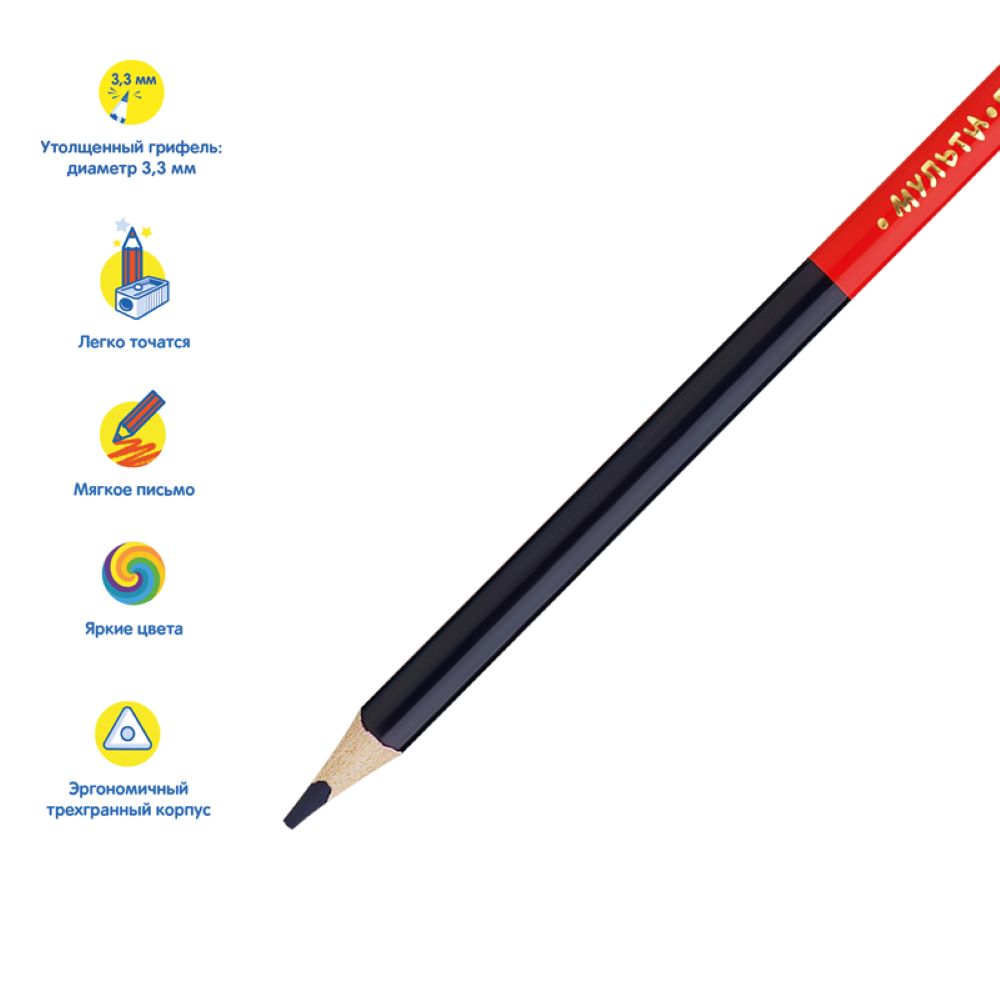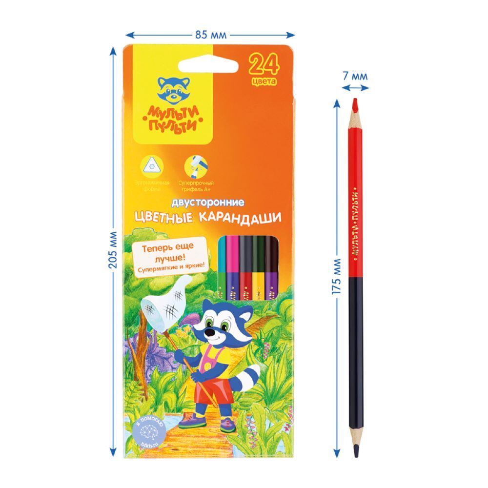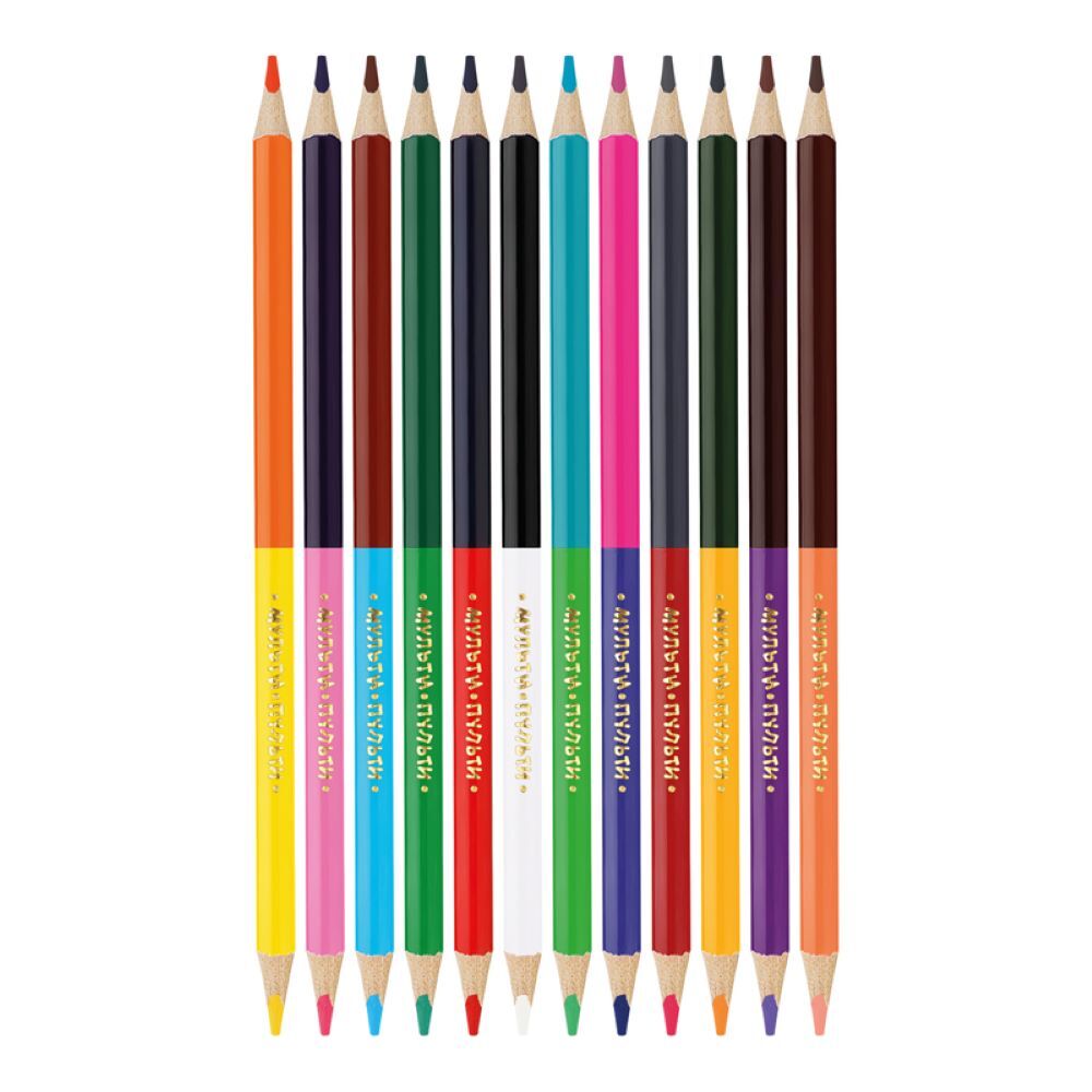 Карандаши цветные двусторонние с заточенным грифелем. Эргономичный трехгранный корпус. Супермягкий грифель диаметром 3,3мм. Яркие насыщенные цвета. Штрихи мягко ложатся на бумагу. Карандаши легко затачиваются. Упакованы в картонную лакированную коробку со склеенным европодвесом. Для детей старше 3-х лет.
