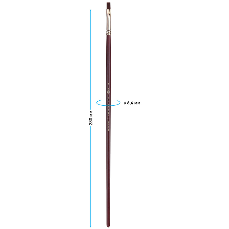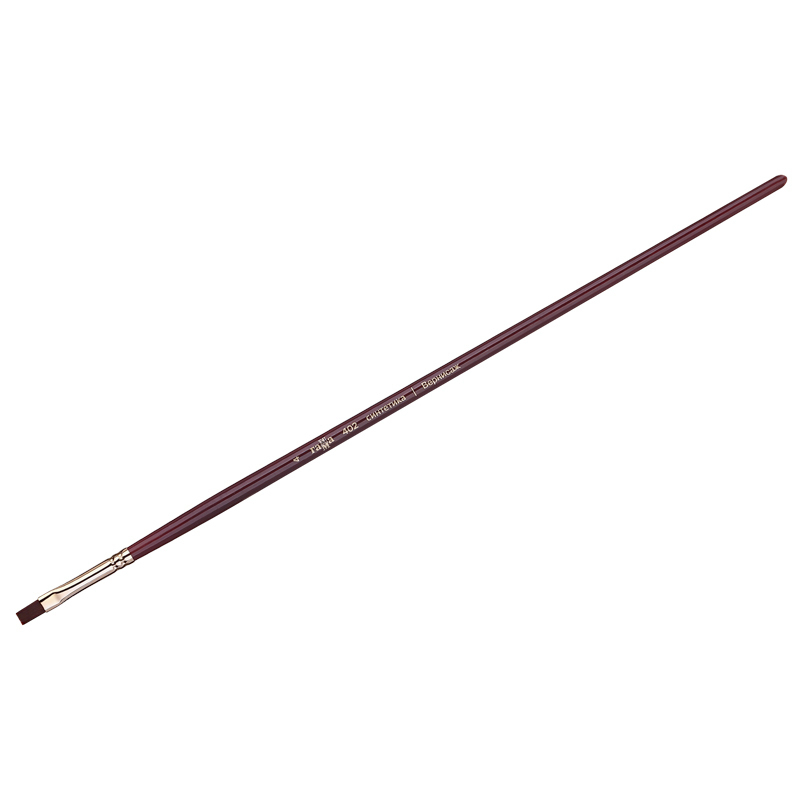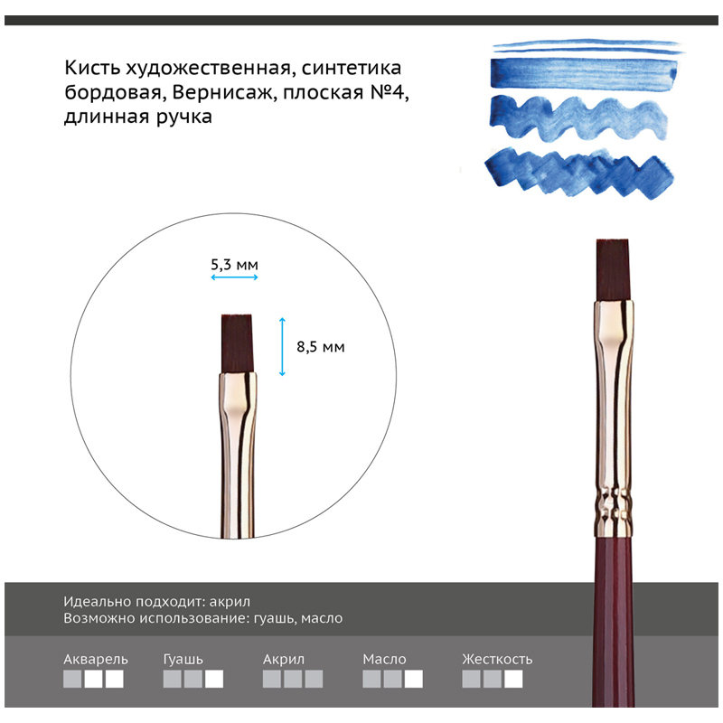 Кисть синтетика Гамма "Вернисаж", плоская №4, длинная бордовая ручка. Художественные кисти серии «Вернисаж» средней жёсткости выполнены из высококачественного синтетического ворса бордового цвета, обладают повышенной износоустойчивостью, хорошо держат форму. Кисти серии «Вернисаж» собраны из тончайшего синтетического ворса, хорошо набирают краску и позволяют контролировать отдачу красок. Кисть предназначена для работы с акриловыми красками, отлично сочетает упругость с удивительно тонким чувством мазка. На усмотрение художника может использоваться с масляными красками и другими материалами для живописи и декорирования. Пучок кисти проклеен химически-стойким клеем и надежно прикреплен к древку кисти. Кисти выполнены на длинной ручке, покрытой глянцевым лаком насыщенного бордового цвета, совпадающим с цветом ворса. Кисть имеет никелированную бесшовную обойму и цветную лакированную ручку.