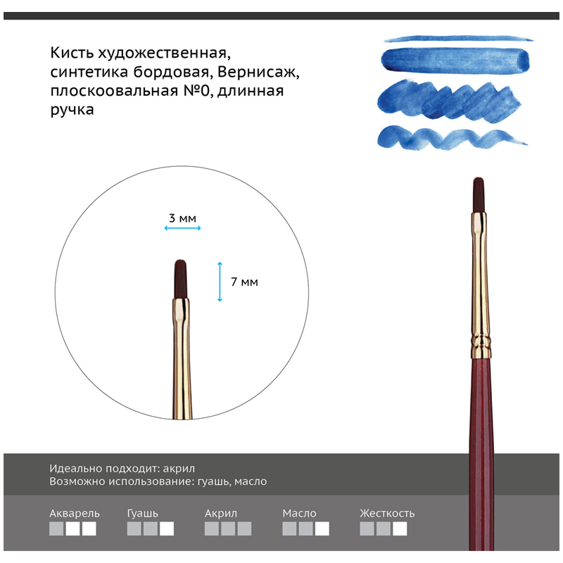 Кисть синтетика Гамма "Вернисаж", плоскоовальная №0, длинная бордовая ручка. Художественные кисти серии «Вернисаж» средней жёсткости выполнены из высококачественного синтетического ворса бордового цвета, обладают повышенной износоустойчивостью, хорошо держат форму. Кисти серии «Вернисаж» собраны из тончайшего синтетического ворса, хорошо набирают краску и позволяют контролировать отдачу красок. Кисть предназначена для работы с акриловыми красками, отлично сочетает упругость с удивительно тонким чувством мазка. На усмотрение художника может использоваться с масляными красками и другими материалами для живописи и декорирования. Пучок кисти проклеен химически-стойким клеем и надежно прикреплен к древку кисти. Кисти выполнены на длинной ручке, покрытой глянцевым лаком насыщенного бордового цвета, совпадающим с цветом ворса. Кисть имеет никелированную бесшовную обойму и цветную лакированную ручку.