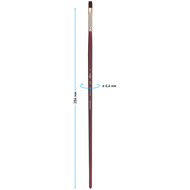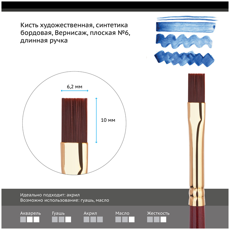 Кисть синтетика Гамма "Вернисаж", плоская №6, длинная бордовая ручка. Художественные кисти серии «Вернисаж» средней жёсткости выполнены из высококачественного синтетического ворса бордового цвета, обладают повышенной износоустойчивостью, хорошо держат форму. Кисти серии «Вернисаж» собраны из тончайшего синтетического ворса, хорошо набирают краску и позволяют контролировать отдачу красок. Кисть предназначена для работы с акриловыми красками, отлично сочетает упругость с удивительно тонким чувством мазка. На усмотрение художника может использоваться с масляными красками и другими материалами для живописи и декорирования. Пучок кисти проклеен химически-стойким клеем и надежно прикреплен к древку кисти. Кисти выполнены на длинной ручке, покрытой глянцевым лаком насыщенного бордового цвета, совпадающим с цветом ворса. Кисть имеет никелированную бесшовную обойму и цветную лакированную ручку.