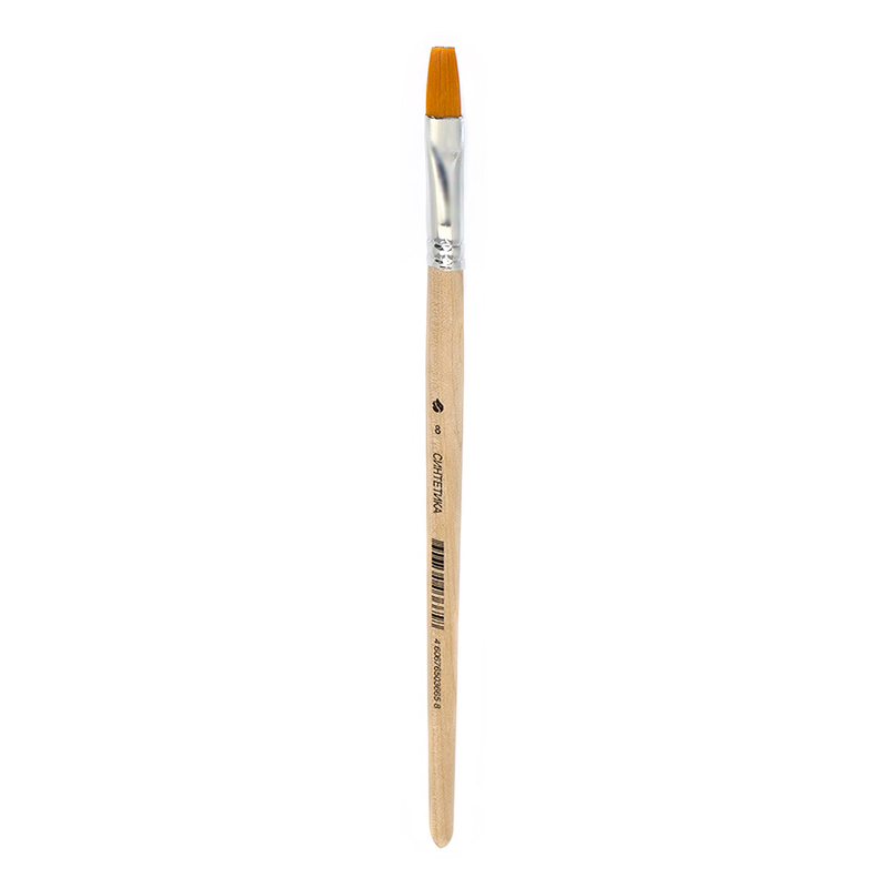 Кисть синтетика плоская №8 Художественные Материалы, короткая ручка, серии "Школьная". Кисти из синтетического волокна в последнее время все прочнее закрепляются среди инструментов для художественного творчества. Упругость синтетического волокна делает его отличным для жидких красок. Оно не имеет такую же способность удерживать краску, как натуральное волокно, но оно прочнее.