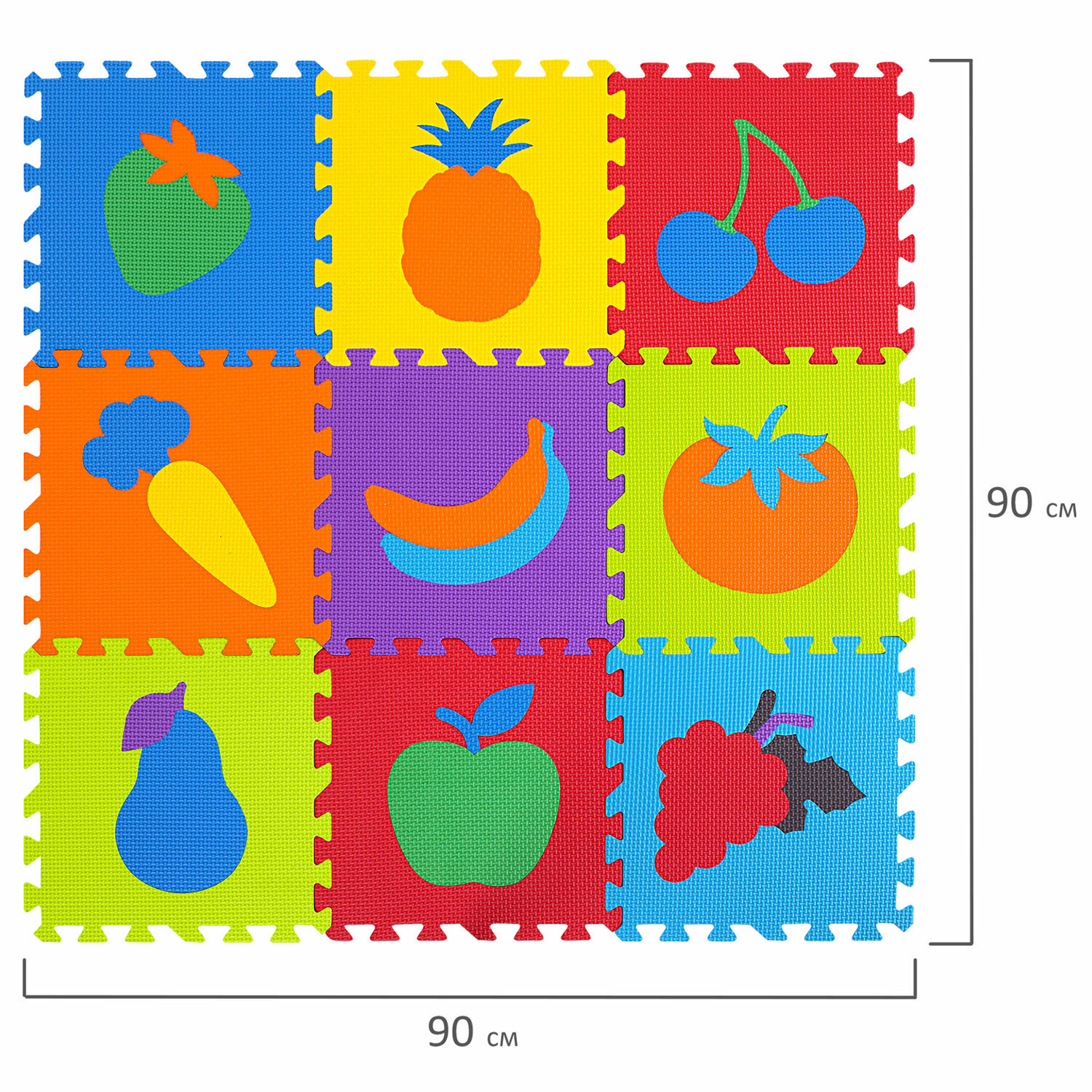 Мягкие коврики обладают теплоизоляционными и шумоизоляционными свойствами. Легко собираются и разбираются, удобны и компактны в хранении. Коврик-пазл состоит из 9 квадратных элементов размерами 30х30 см. Толщина элементов составляет 1 см. Общая площадь - 90х90 см. Коврик содержит разборные элементы в виде различных фруктов и овощей, благодаря чему носит не только развлекательный, но и обучающий характер. Яркие, разнообразные цвета заинтересуют ребенка. Коврик обладает антискользящим эффектом, смягчает удары при падении. Играть на коврике удобно и тепло. Разборные элементы легко вынимаются и собираются обратно, квадратные элементы-пазлы позволяют строить различные сооружения, способствуя развитию моторики и пространственного мышления. Коврики изготовлены из безопасного, мягкого и лёгкого материала - этиленвинилацетата (100% ЭВА). После вскрытия упаковки перед первым использованием рекомендуется промыть элементы коврика-пазла теплой водой с мылом и просушить. Внимание! Цвета деталей коврика могут отличаться от представленных на фото.