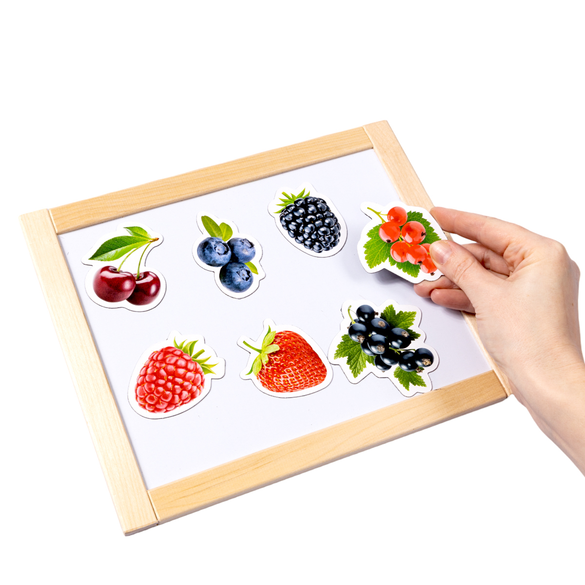 Развивающие магниты из серии «Магнитные истории» помогут малышу расширить знания о мире, тренировать мелкую моторику рук и развивать творческие способности. В набор входит 7 мягких магнитов - вишня, черная смородина, красная смородина, малина, черника, клубника и ежевика. Магниты размещены на листе-рамке размером 21,5 х 14,5 см, из которого легко вынимаются. Игра предназначена для детей от 3 лет. С магнитами можно играть на дверце холодильника или на специальном магнитном планшете (не входит в набор) – фигурки крепко держатся на любой металлической поверхности. Магниты набора можно использовать в качестве кукол для магнитного домашнего театра. Игрушка из картона и магнитного винила для игры внутри помещений. Полностью безопасна.