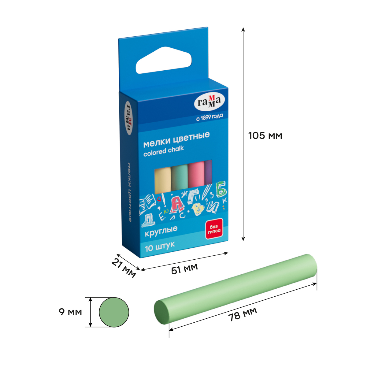 Набор из 10 круглых школьных мелков ГАММА для классных и аудиторных досок, а также для рисования на асфальте состоит из 10 ярких цветов ассорти.