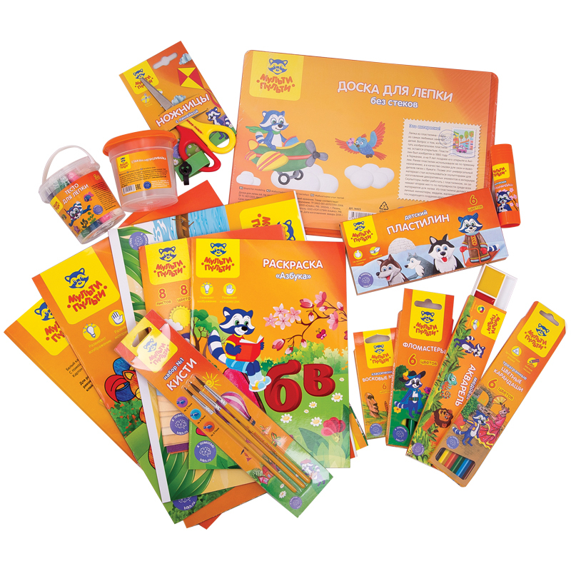 В состав набора вошли лучшие продукты «Мульти-Пульти»: Набор принадлежностей для творчества Мульти-Пульти - отличный подарок юному художнику. Он содержит все необходимые материалы для занятий творчеством. Яркий дизайн обязательно привлечет внимание ребенка! В состав набора вошли лучшие продукты Мульти-Пульти: альбом для рисования, цветной картон А4, цветная бумага A4, клей-карандаш, раскраска пластилином, доска для лепки, пластилин, мелки пластиковые, карандаши цветные, карандаш чернографитный (2 шт.), набор кистей, акварель, ножницы детские, фломастеры, ластик, глазки декоративные, набор для творчества «Игрушка из бумажного пакета».