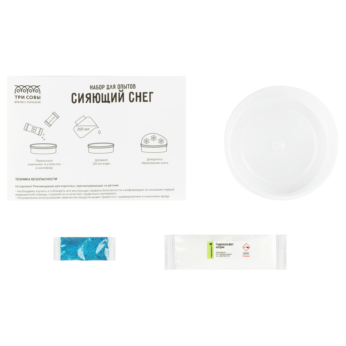 Набор для опытов познакомит ребенка с химическими и физическими законами, разовьёт любознательность, позволит самостоятельно провести первый научный эксперимент дома и увлекательно провести время. Набор для химических опытов "Искусственный сияющий снег" не займет много времени и не потребует усилий. В набор входит: кристаллические соли, пластик, глиттер. В процессе опыта на ваших глазах сухой порошок превращается в сияющий искусственный снег, из которого можно лепить. Подробная инструкция с указанием техники безопасности и пошаговыми действиями входит в состав набора. Научно-познавательные опыты можно проводить детям от 8 лет под контролем взрослых.
