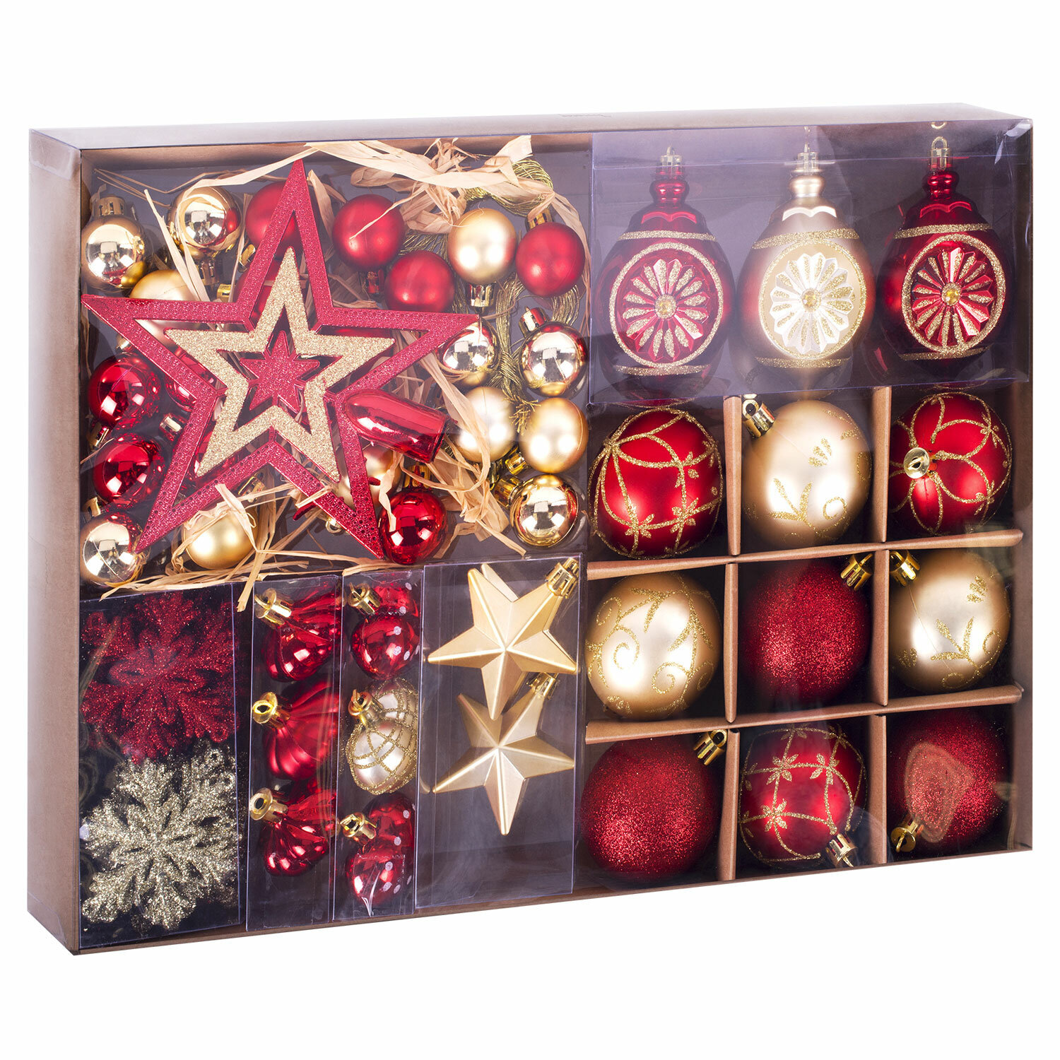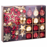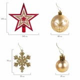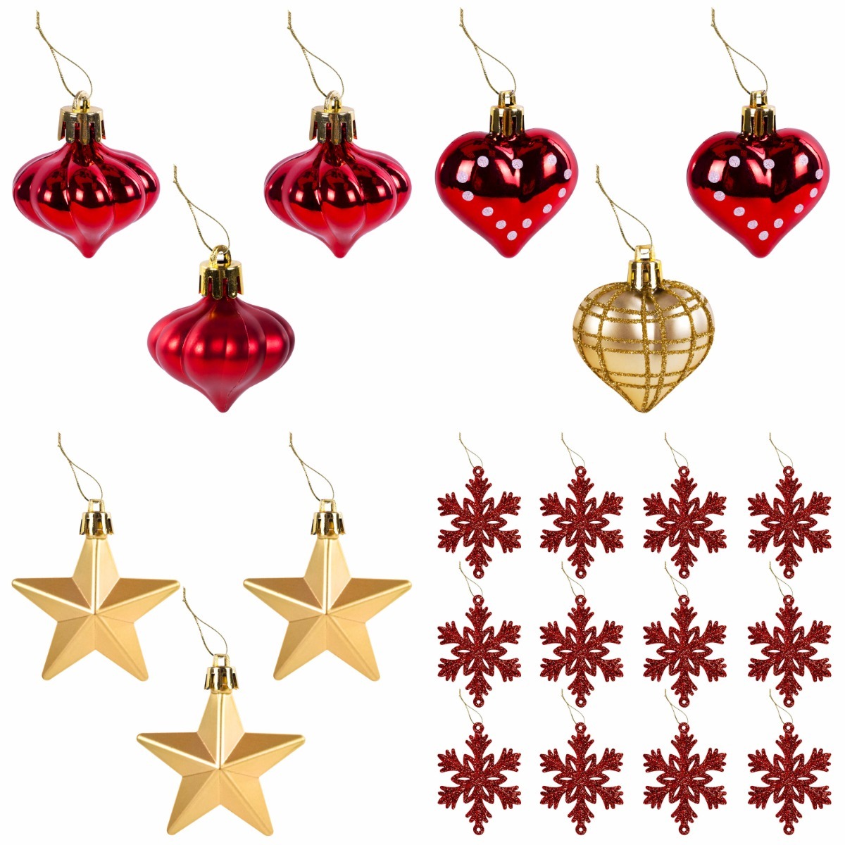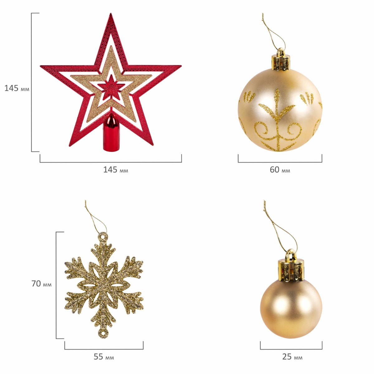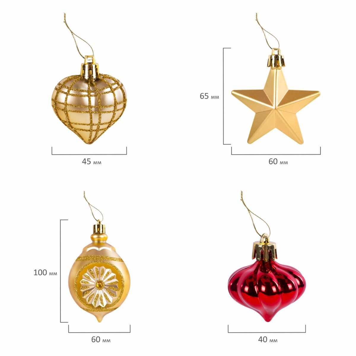 Набор ярких елочных украшений состоит из 70 пластиковых декоративных игрушек для новогодней ели разной формы: сферической формы, в форме звезды, снежинки, сердца, пятиконечной звезды. Диаметр шаров в наборе 25мм и 60мм. Высота макушки - 15см. Фигуры выполнены в золотистом и красном цветах с различными эффектами: глянцевые, матовые и с эффектом "глиттер". В наборе также есть нитки из полиэстера для подвешивания шаров золотистого цвета 36 шт. длиной 30 см каждая. Данные украшения будут отлично смотреться как на зеленой, так и на белой хвое. Такой декор точно сделает Новый год особенным, а Вашу новогоднюю елку незабываемой и уникальной. Цветопередача может отличаться в зависимости от экрана вашего телефона!