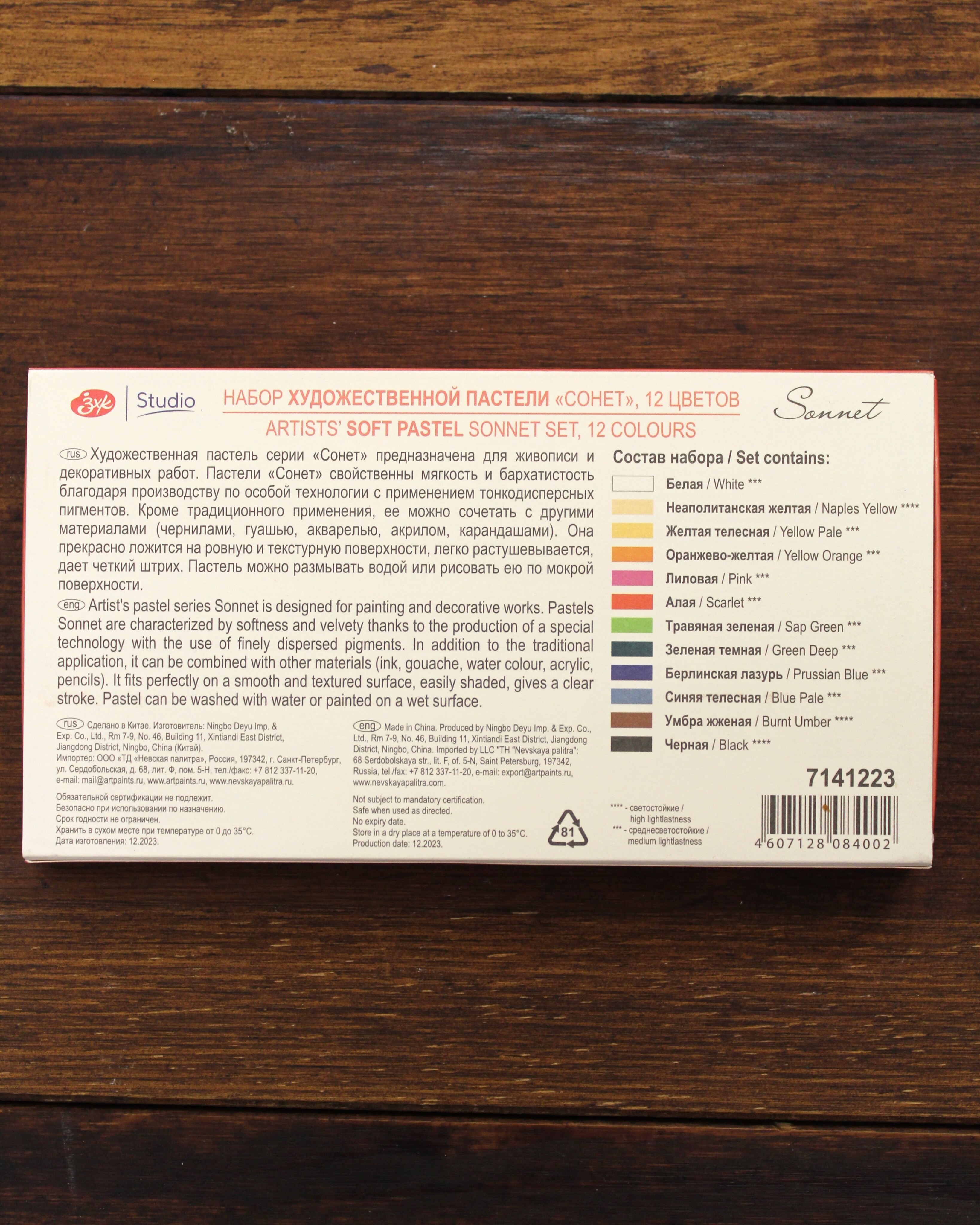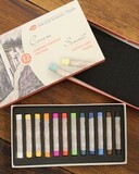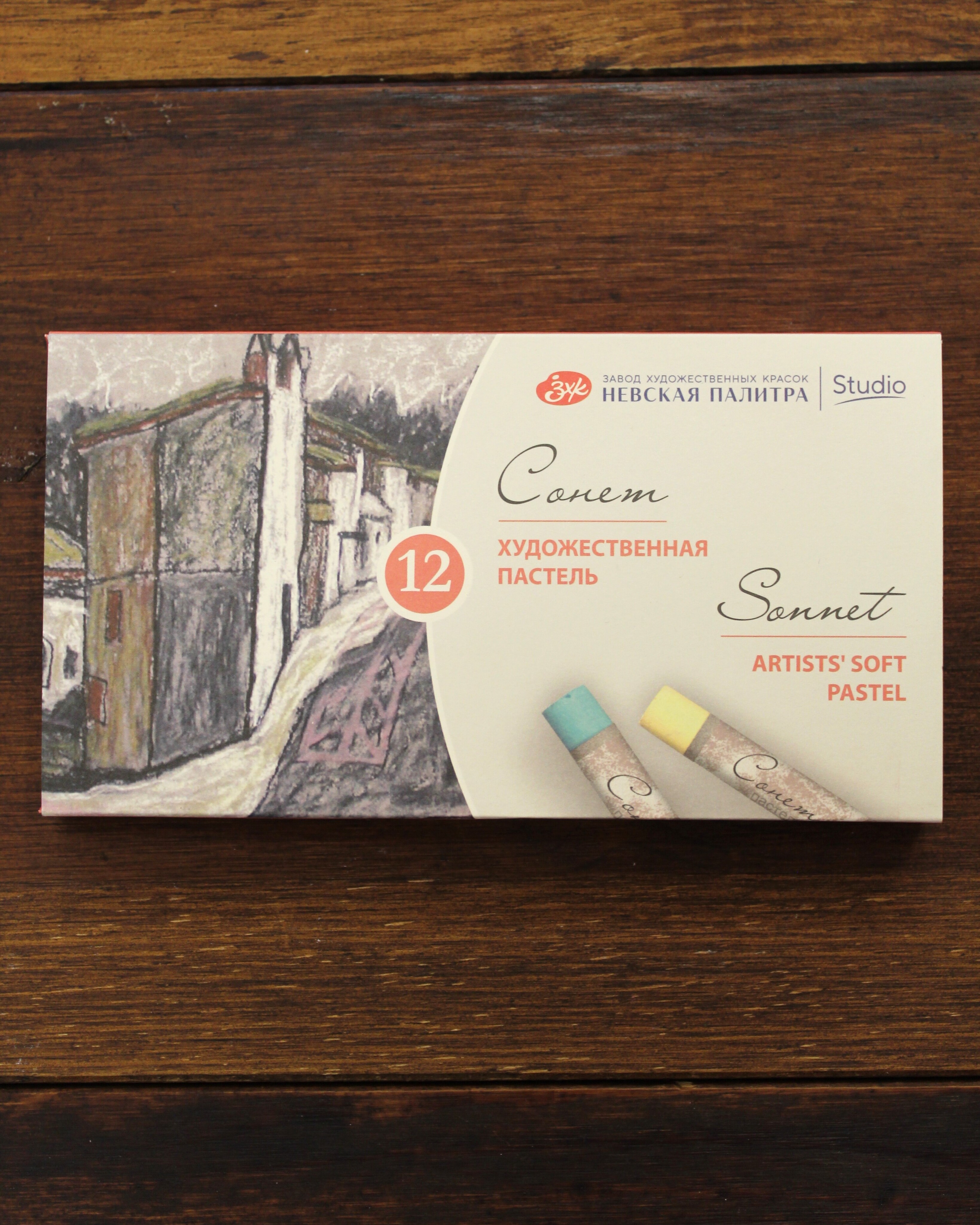 Изготавливается из качественных материалов, с применением тонкодисперсных пигментов. Пастель легко растушевывается, прекрасно ложится как на ровную повехность, так и на текстурную, помимо этого мелками можно создавать четкие штрихи. Также пастель Сонет можно размывать водой или рисовать по мокрой поверхности. В наборе 12 цветов.