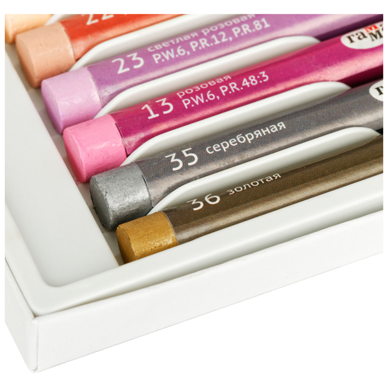 Масляная пастель «Студия» изготовлена на основе тонкотертых пигментов и минерального масла. Оставляет мягкий штрих, легко растушевывается. Широкий диапазон творческих возможностей: от наброска до полноценной картины. Яркие насыщенные цвета не светлеют и не темнеют со временем. Масляная пастель рисует на поверхностях разных фактур, не осыпается и не требует использования закрепителя краски.