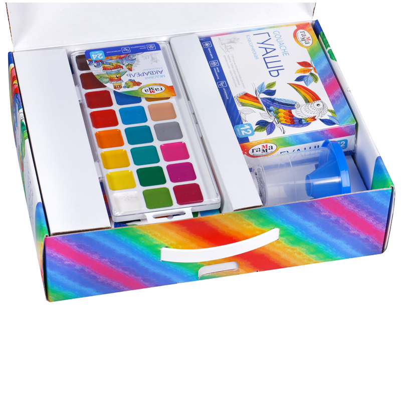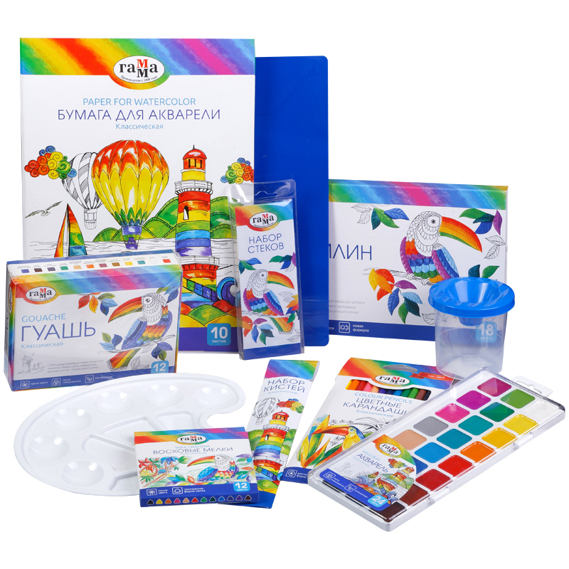 В набор вошли лучшие продукты серии, а также вспомогательные материалы: акварель медовая «Классическая» 24 цв., гуашь «Классическая» 12 цв., 20 мл, пластилин «Классический» 18 цв., карандаши цветные «Классические» 12 цв., восковые мелки «Классические» 12 цв., кисть пони круглая №2, кисть пони круглая №5, №8, кисть синтетика плоская №3, №5, набор акварельной бумаги (10 листов), доска для лепки А4, стакан-непроливайка, палитра художника овальная, набор стеков «Классический» 4 шт.