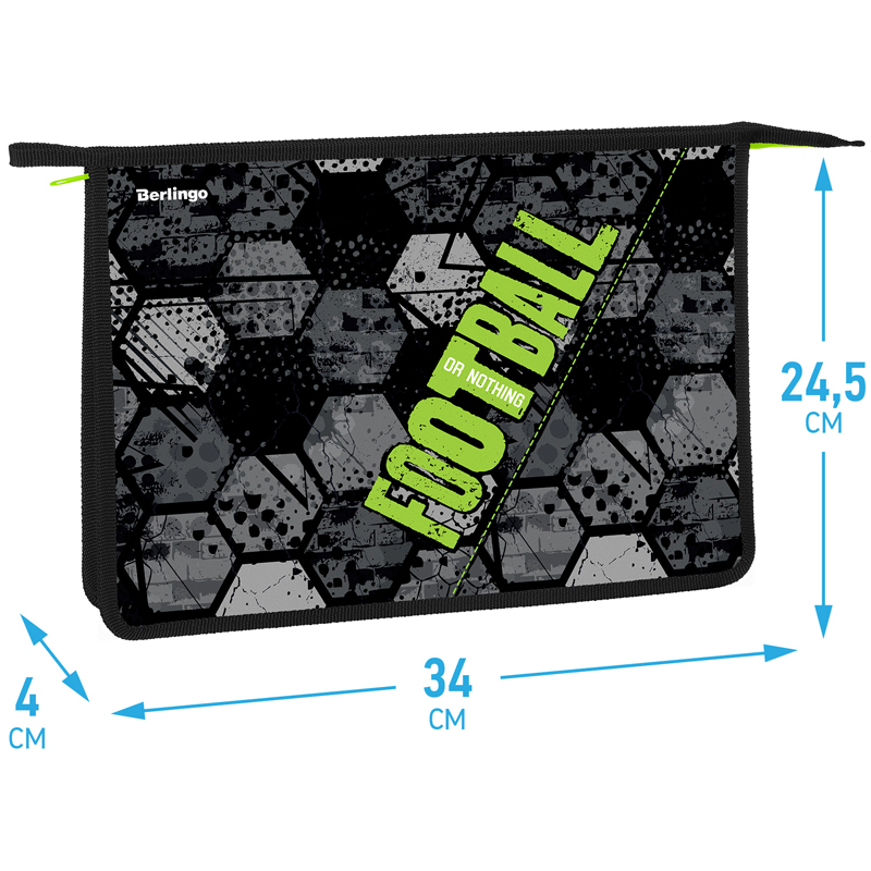 Папка школьная для тетрадей на молнии Berlingo Football or nothing формата А4 предназначена для хранения учебных принадлежностей. Изделие размером 340*245*40 мм имеет одно отделение. Застежка-молния сверху надежно защищает содержимое от грязи и влаги. Края папки имеют тканевую окантовку. Изготовлена из высококачественного пластика тёмно-серого цвета. Яркий дизайн обязательно привлечёт внимание мальчиков.