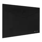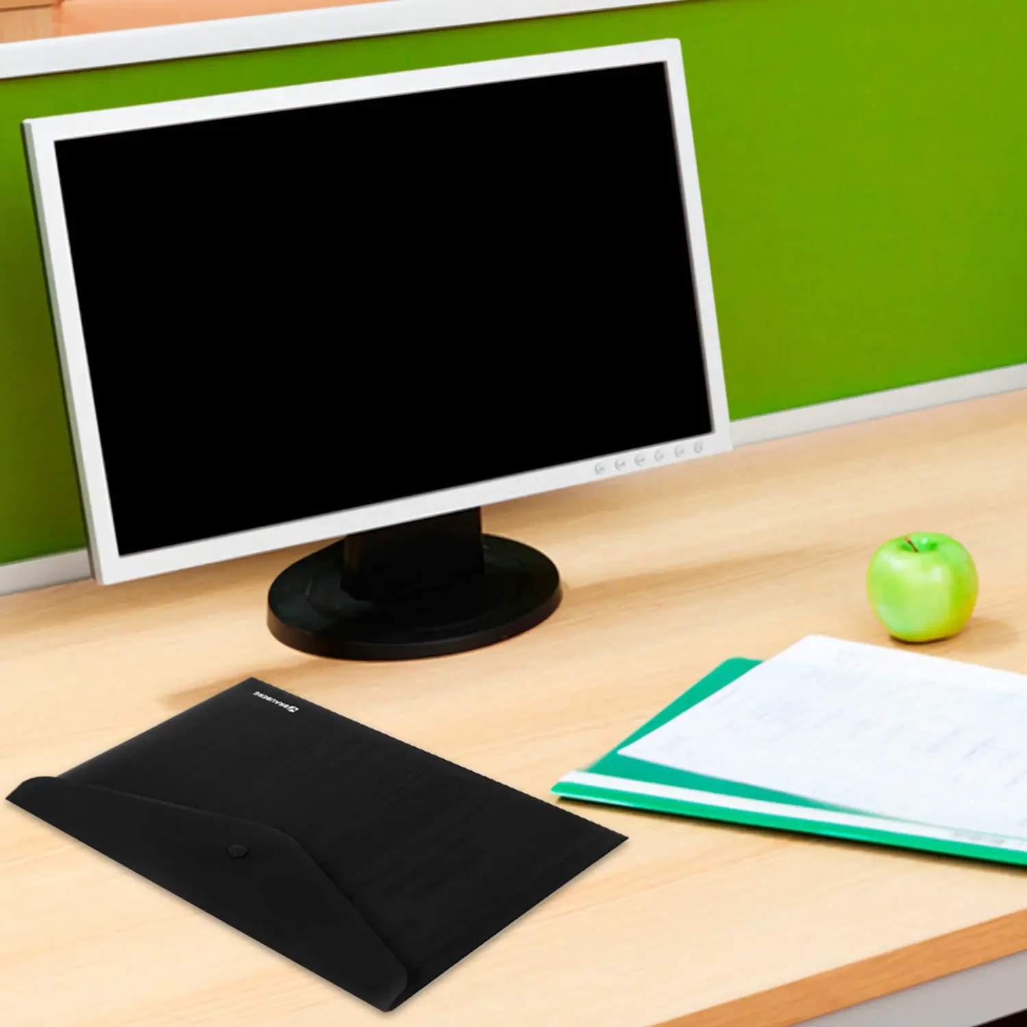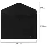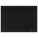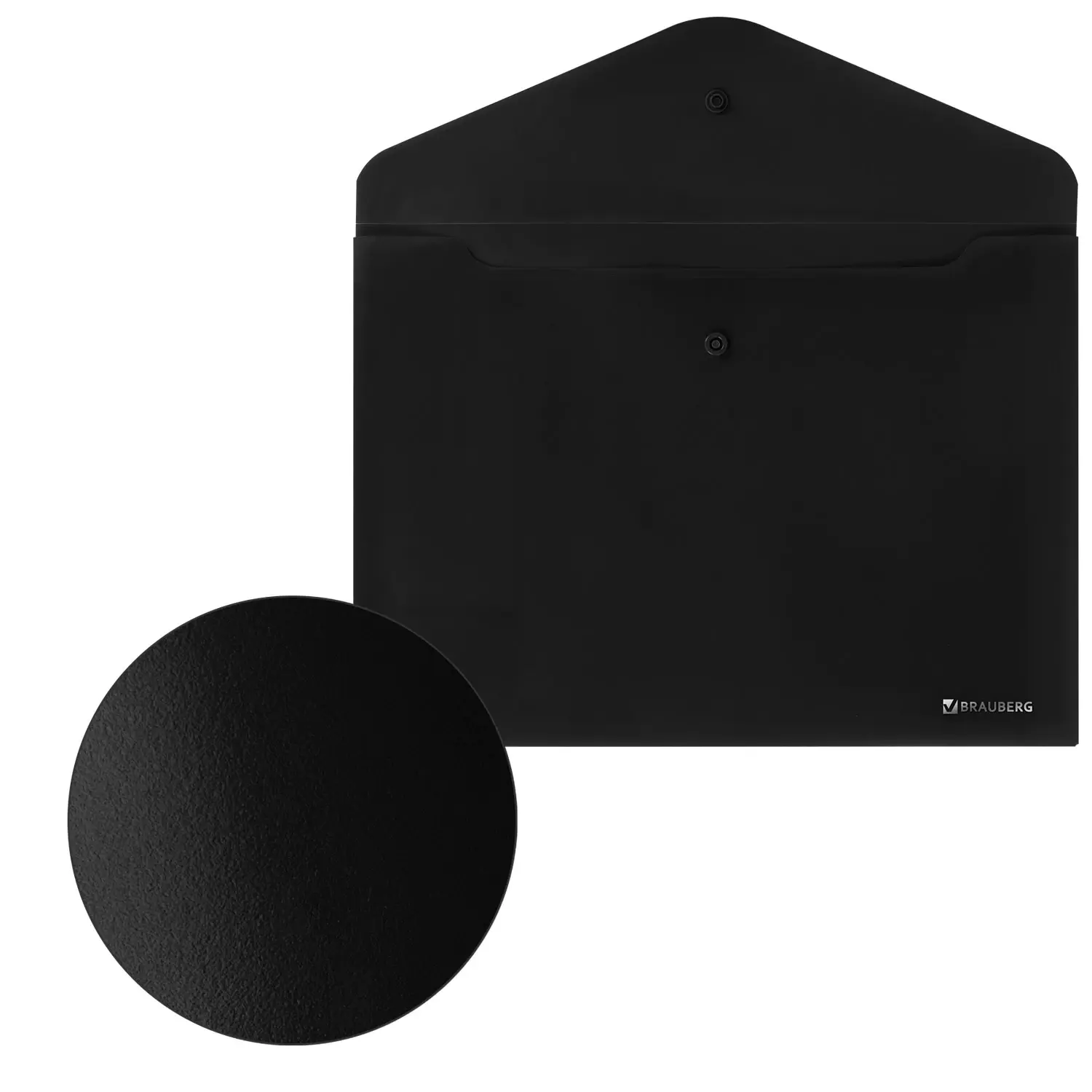 Папка-конверт с матовой фактурой формата А4 изготовлена из плотного непрозрачного пластика. Цвет – черный, толщина – 200 мкм. Закрывается на защелку-кнопку, что делает удобным частое использование и обеспечивает быстрый доступ к содержимому. Папка способна вместить до 100 листов стандартной плотности.
