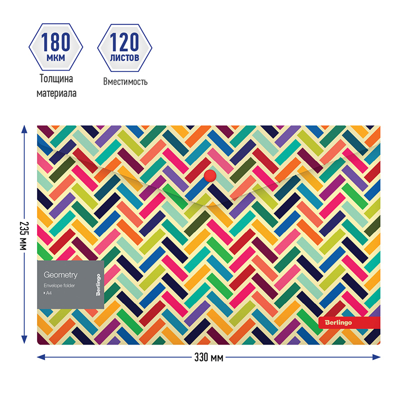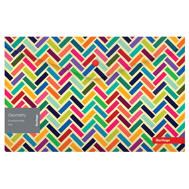Папка-конверт на кнопке Berlingo серии Geometry формата А4 станет ярким функциональным помощником для хранения документов со стильным геометрическим рисунком. Изготовлена из высококачественного полипропилена толщиной 180 мкм с матовой текстурой поверхности "апельсиновая корка", на которой не видно отпечатков пальцев и мелких царапин. , ориентация – горизонтальная. Вместимость папки – 120 листов. Надежная застежка-кнопка красного цвета защищает документы от повреждений и загрязнений, обеспечивая быстрый доступ к содержимому.