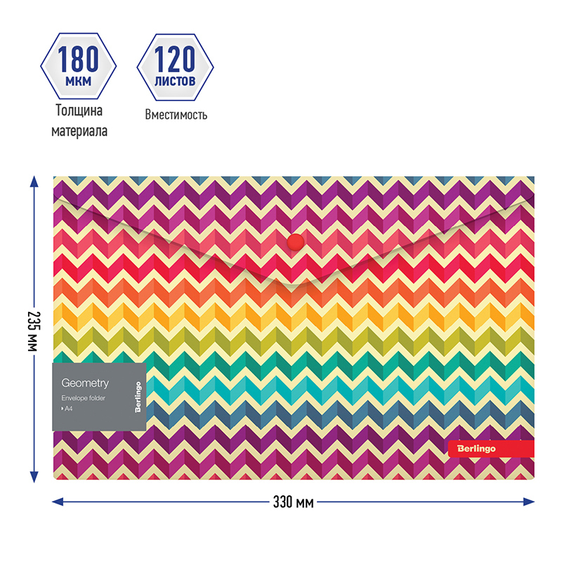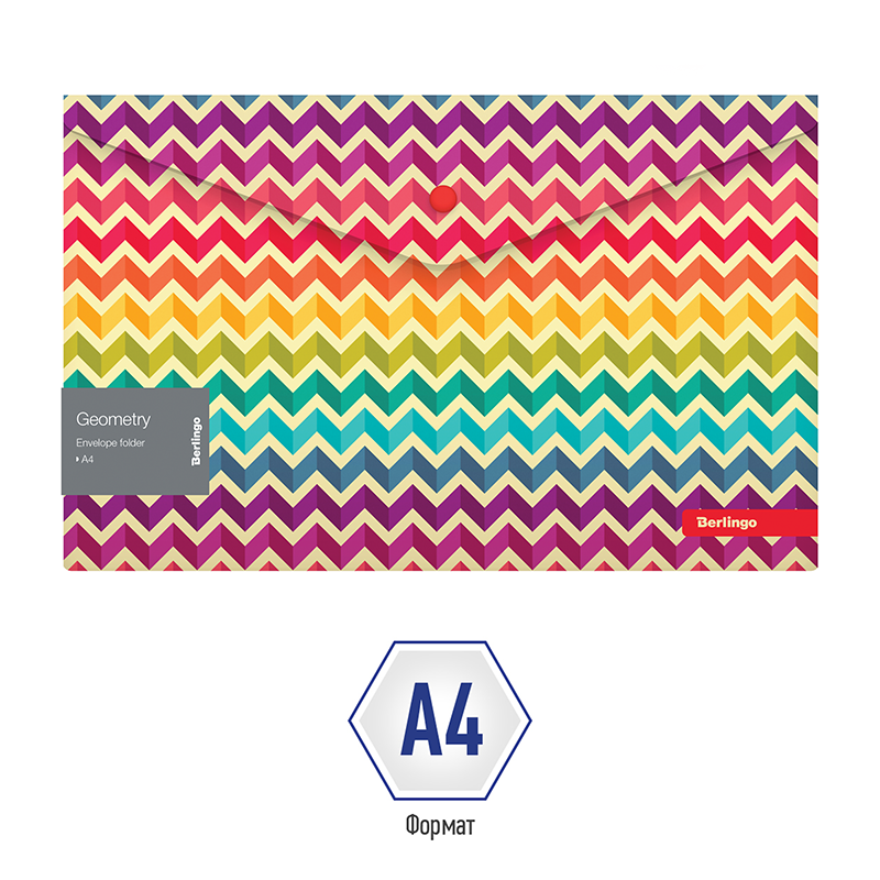 Папка-конверт на кнопке Berlingo серии Geometry формата А4 станет ярким функциональным помощником для хранения документов со стильным геометрическим рисунком. Изготовлена из высококачественного полипропилена толщиной 180 мкм с матовой текстурой поверхности "апельсиновая корка", на которой не видно отпечатков пальцев и мелких царапин. Размер папки составляет 330*230*30 мм., ориентация – горизонтальная. Вместимость папки – 120 листов. Надежная застежка-кнопка красного цвета защищает документы от повреждений и загрязнений, обеспечивая быстрый доступ к содержимому.