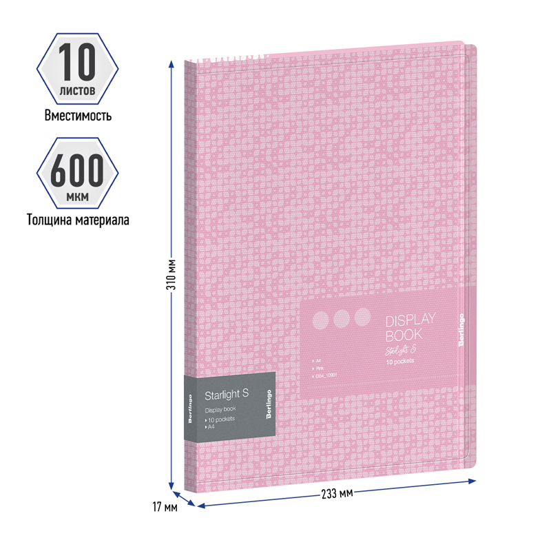 Папка с вкладышами Berlingo формата А4 содержит 10 вкладышей, которые надежно защищают листы от повреждений. Листы-карманы увеличенной толщины 30мкм надежно скреплены сваркой. Толщина материала 600мкм, размер составляет 310*230мм. Изготовлена из высококачественного полипропилена с матовой текстурой поверхности "песок", на которой не видно отпечатков пальцев и мелких царапин. Прозрачные вкладыши позволяют вам легко организовать и упорядочить документы, так что вы всегда можете быстро найти то, что нужно. В дополнение, на внутренней стороне обложки предусмотрен плотный прозрачный карман для удобного хранения мелочей: ручки, заметок, визиток, дисков, флешек и др. Эта папка не требует перфорации бумаг дыроколом, так что вы можете хранить в ней документы любого формата без проблем. Вмещает до 100 бумажных листов.