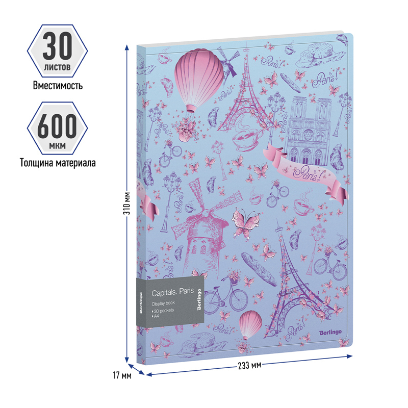 Папка с вкладышами Berlingo серии Capitals. Paris формата А4 с нежным рисунком с изображением Эйфелевой башни предназначена для хранения документов. Папка имеет размер 310*233*17 мм. Она изготовлена из полипропилена с матовой текстурой поверхности "песок", на которой не видно отпечатков пальцев и мелких царапин. Имеет белый цвет во внутренней стороне папки. Ширина корешка 17 мм. Содержит 30 прозрачных листов-карманов увеличенной толщины 30мкм, надежно скрепленных сваркой. На внутренней стороне обложка оснащена плотным прозрачным карманом для удобного хранения мелочей: ручки, заметок, визиток, дисков, флешек и др. Папка вмещает до 100 бумажных листов.