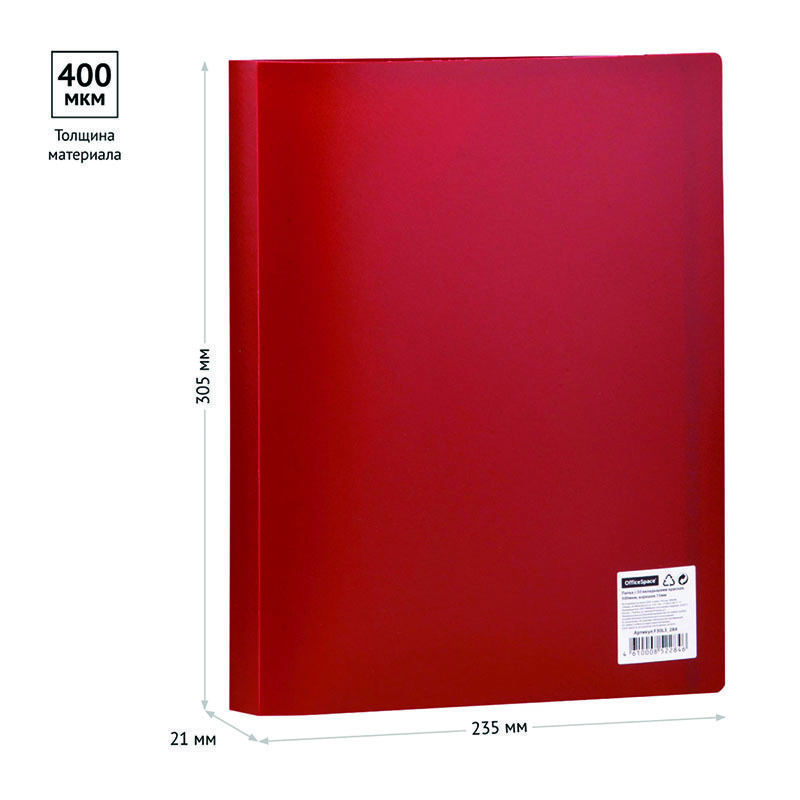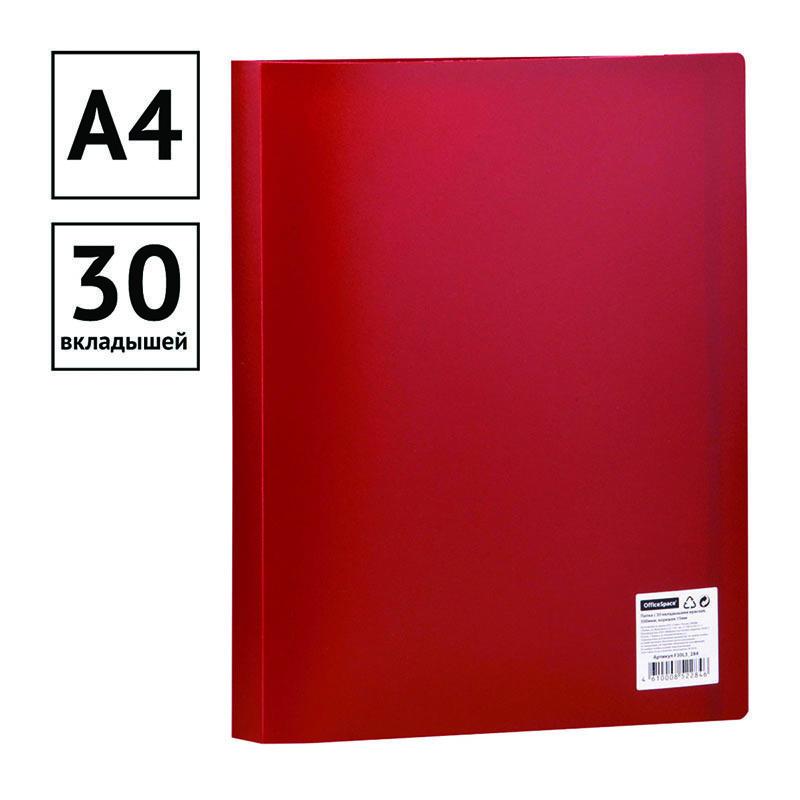 Папка с 30 вкладышами OfficeSpace формата А4 – это функциональный аксессуар для работы и учебы, который выполнен в классическом красном цвете. Папка размером 310*230*21 мм изготовлена из плотного пластика толщиной 0,6 мм с текстурой «песок» и предназначена для транспортировки, упорядочивания и хранения бумаг. Ширина корешка 21 мм. Вкладыши защищают документы от повреждений и загрязнений. В каталоге нашего интернет-магазина Вы также сможете подобрать сопутствующие товары для хобби и творчества, школы и офиса, а также приятные мелочи для дома и души.