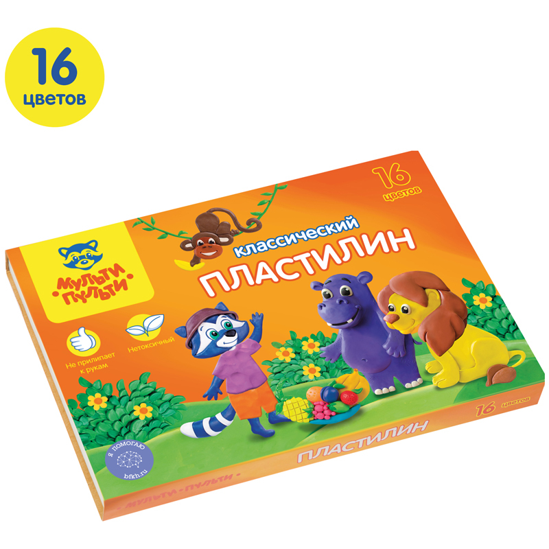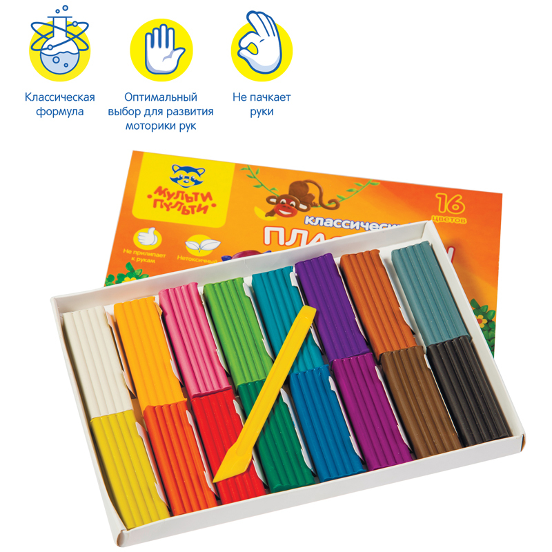 Пластилин Мульти-Пульти предназначен для лепки и моделирования. Не прилипает к рукам, имеет яркие, сочные цвета, которые легко смешиваются друг с другом. Для детей старше 3-х лет. В наборе 16 брусков по 20 грамм классического пластилина. Стек в комплекте.