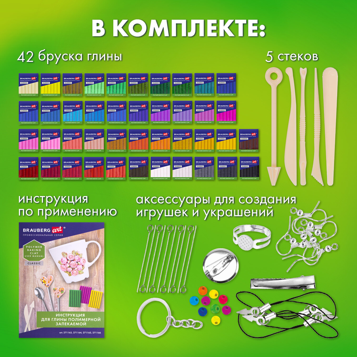 Если вы мечтаете о создании красивого и функционального объекта, пора приступать к работе с полимерной глиной! Запекаемая полимерная глина Brauberg подходит для лепки и моделирования, создания игрушек, украшений, предметов интерьера, сувениров. Масса мягкая, поэтому вы легко придадите ей нужную форму. Цвета можно смешивать для получения необходимых оттенков, которые сохранятся после обжига. После запекания изделия становятся прочными и долговечными. Глина ярких и насыщенных цветов, не пачкает и не сушит руки, легко смывается с рук и рабочей поверхности водой или влажными салфетками. Упаковка легко открывается без использования ножа. Если вы не полностью израсходовали блок, то остатки можно завернуть в упаковку — так глина лучше сохранится. Набор включает в себя 42 бруска (по 20 г) полимерной глины разного цвета, 5 пластиковых стеков, комплект аксессуаров для создания поделок и инструкцию по эксплуатации. Изделия из глины следует запекать в духовке при температуре 130 °С в течение 20-40 минут. Время запекания варьируется в зависимости от толщины изделия и, как правило, составляет 20 минут для толщины заготовки не более 6 мм. После запекания глина становится прочной, не трескается, цвета не тускнеют. Набор упакован в красивую подарочную картонную коробку. Перед использованием следует ознакомиться с инструкцией.