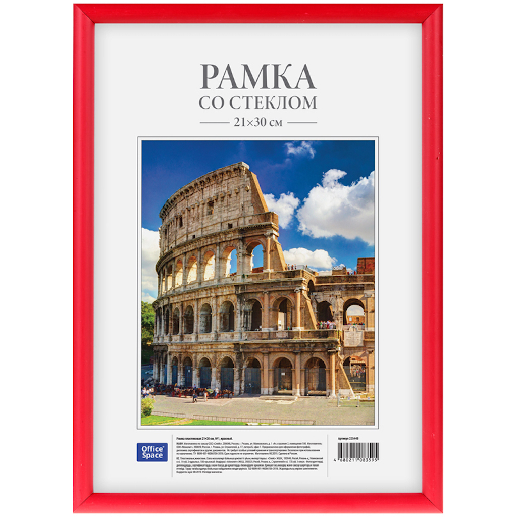 Рамка для фотографий, дипломов, сертификатов, грамот, лицензий и других документов формата А4, цвет красный. Возможность вертикального и горизонтального подвеса. Внимание! Полутон рамки может немного отличаться от представленного на фотографии.Материал вставки - стекло.