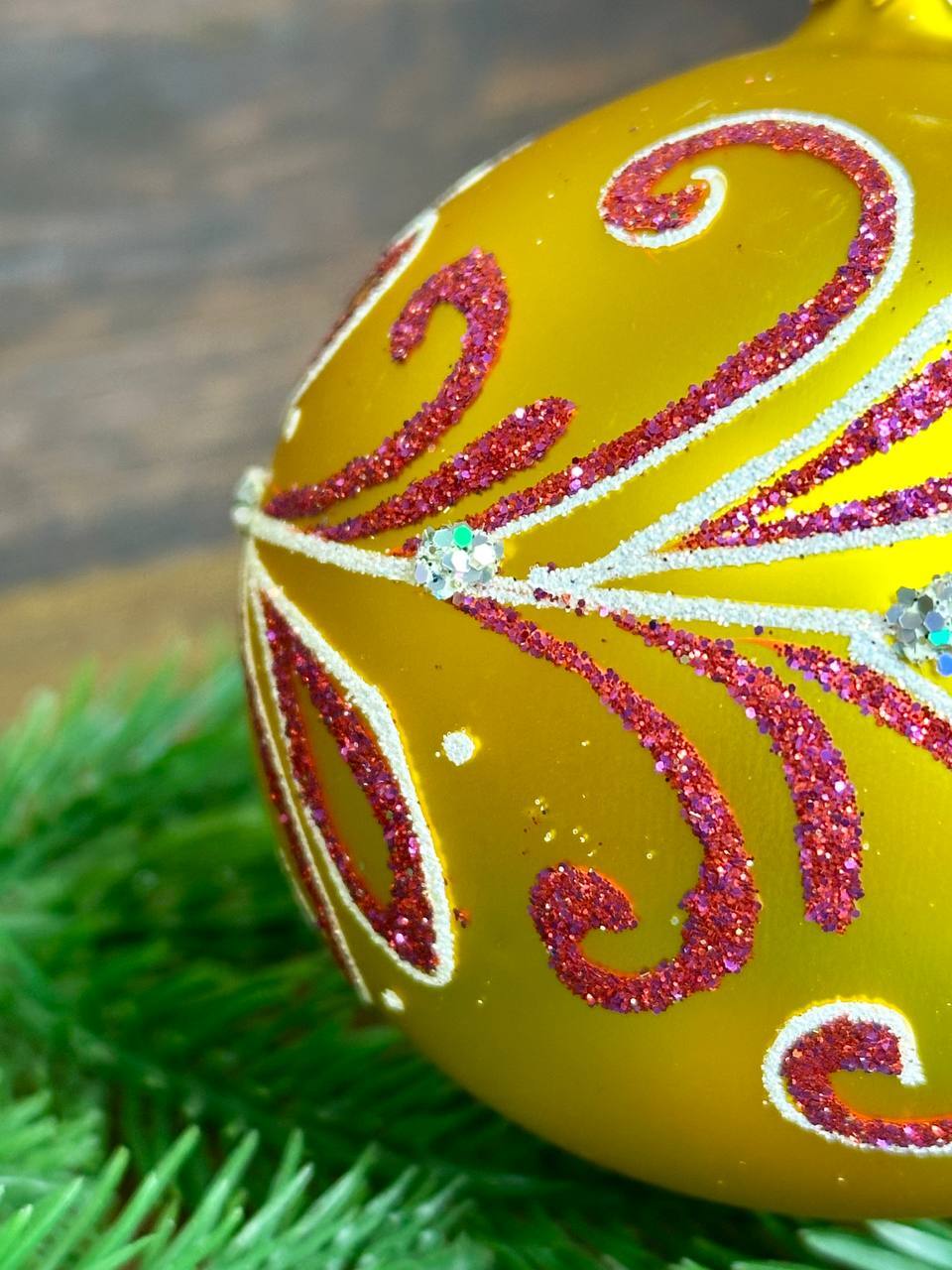 Новогодний подвесной шар - вечная классика, которая поможет расставить эффектные акценты в наряде вашей ели. Подвесной шар выполнен из стекла и декорирован ручной росписью с переливающимися блестками в лучших традициях праздника. Такие шары будут отлично смотреться как на зеленой, так и на белой хвое. Диаметр шара - 7,5 см. Шар для удобства имеет ушко для ниточки или крючка. Послужит приятным подарком или милым дополнением к подарку. Цветопередача может отличаться в зависимости от экрана вашего телефона!