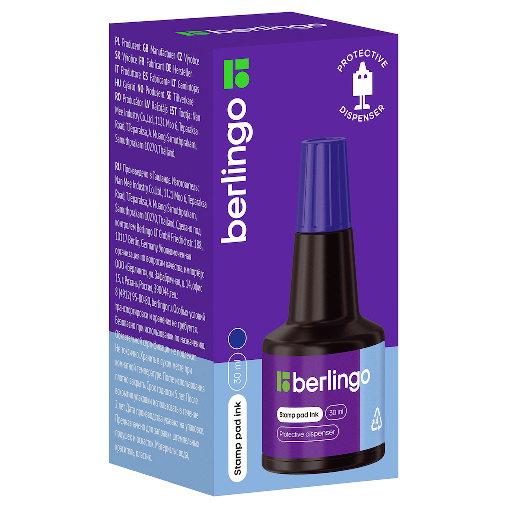 Штемпельная краска на водной основе для заправки штемпельных подушек. Цвет краски - синий. Объем 30 мл. Флакон оснащен дозатором и упакован в индивидуальную коробочку.