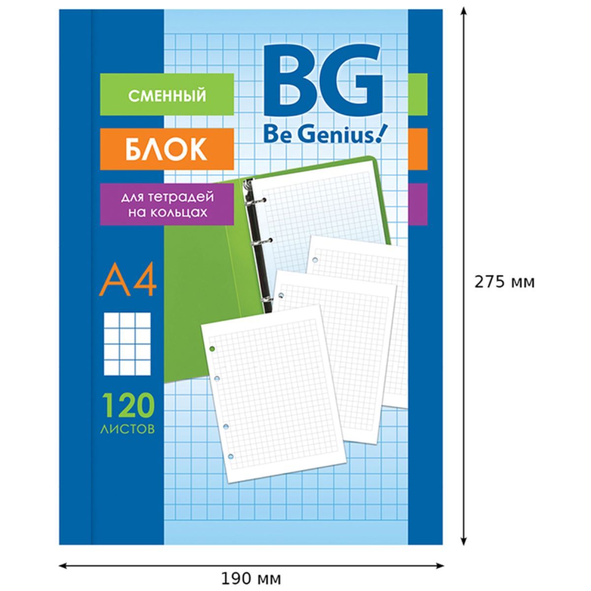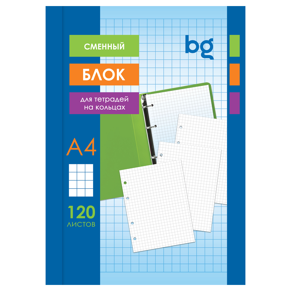 Сменный блок для тетрадей BG формата А4 (190*275 мм). Количество листов – 120 штук. Листы офсетной бумаги плотностью 60 г/м2 в клетку без полей упакованы в термоусадочную плёнку с полноцветной картонной этикеткой.