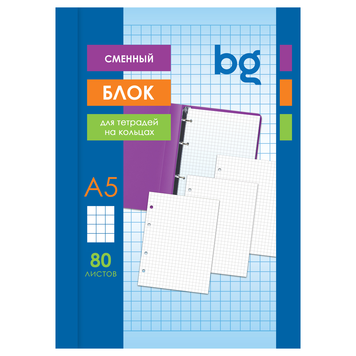 Сменный блок для тетрадей BG формата А5 (148*205 мм). Количество листов – 80 штук. Листы офсетной бумаги плотностью 60 г/м2 в клетку без полей упакованы в термоусадочную плёнку с полноцветной картонной этикеткой.