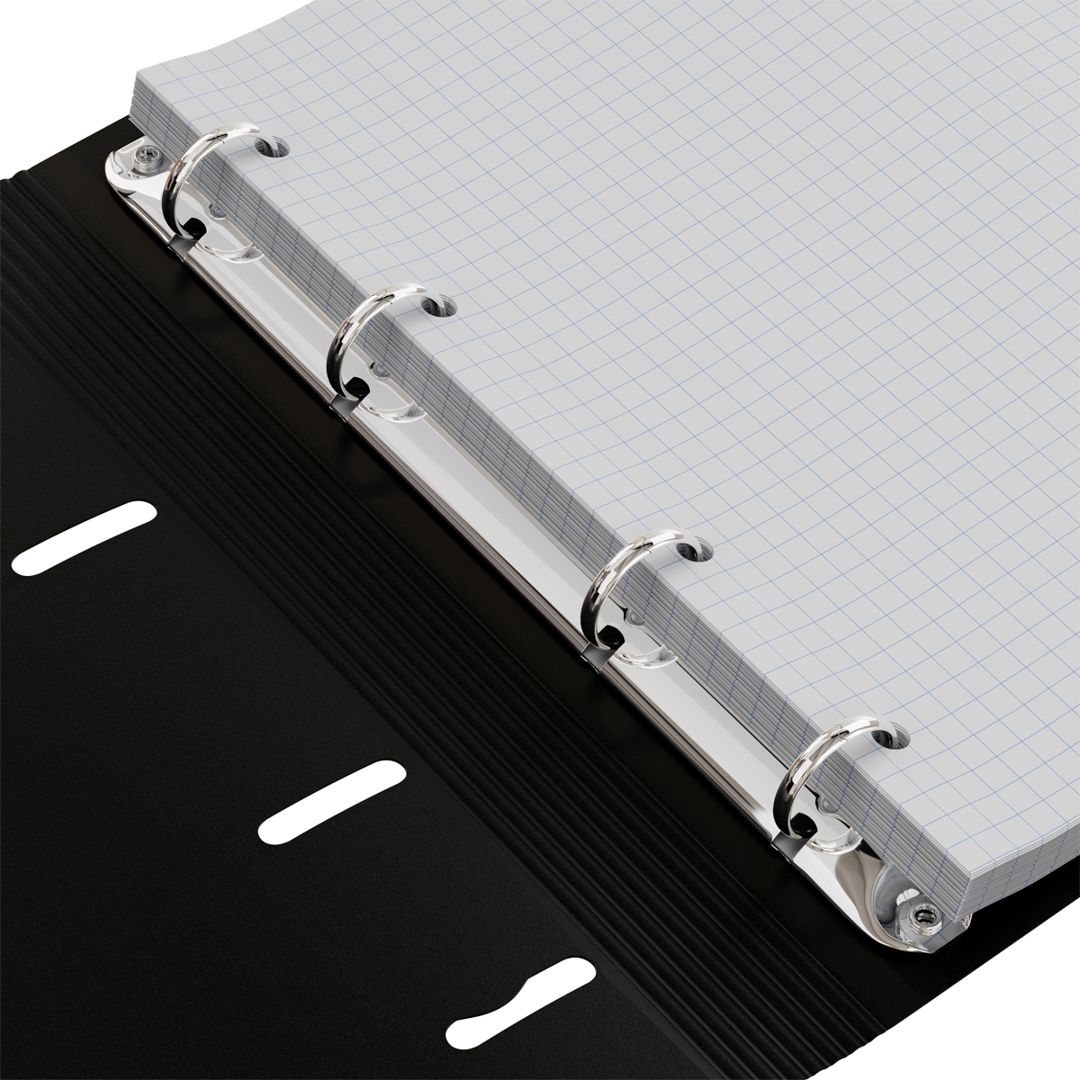 Тетрадь на кольцах формата А5 (220*180 мм) – незаменимый помощник в офисе, учёбе, который удобен для большого объёма записей. Внутренний блок состоит из 120 листов офсетной бумаги белого цвета плотностью 60 г/м2 и 100% белизной. Линовка тетради выполнена в клетку без полей, что делает тетрадь универсальной для любых целей. Тетрадь имеет металлический механизм с 4 кольцами для быстрой смены или добавления листов. Уникальная конструкция механизма обеспечивает лёгкость и удобство в использовании. Страницы можно легко перелистывать, добавлять или извлекать по необходимости. Обложка изготовлена из плотного пластика с фактурой «песок», на котором не видны мелкие царапины и следы пальцев. Тетрадь дополнена креплением - резинкой.