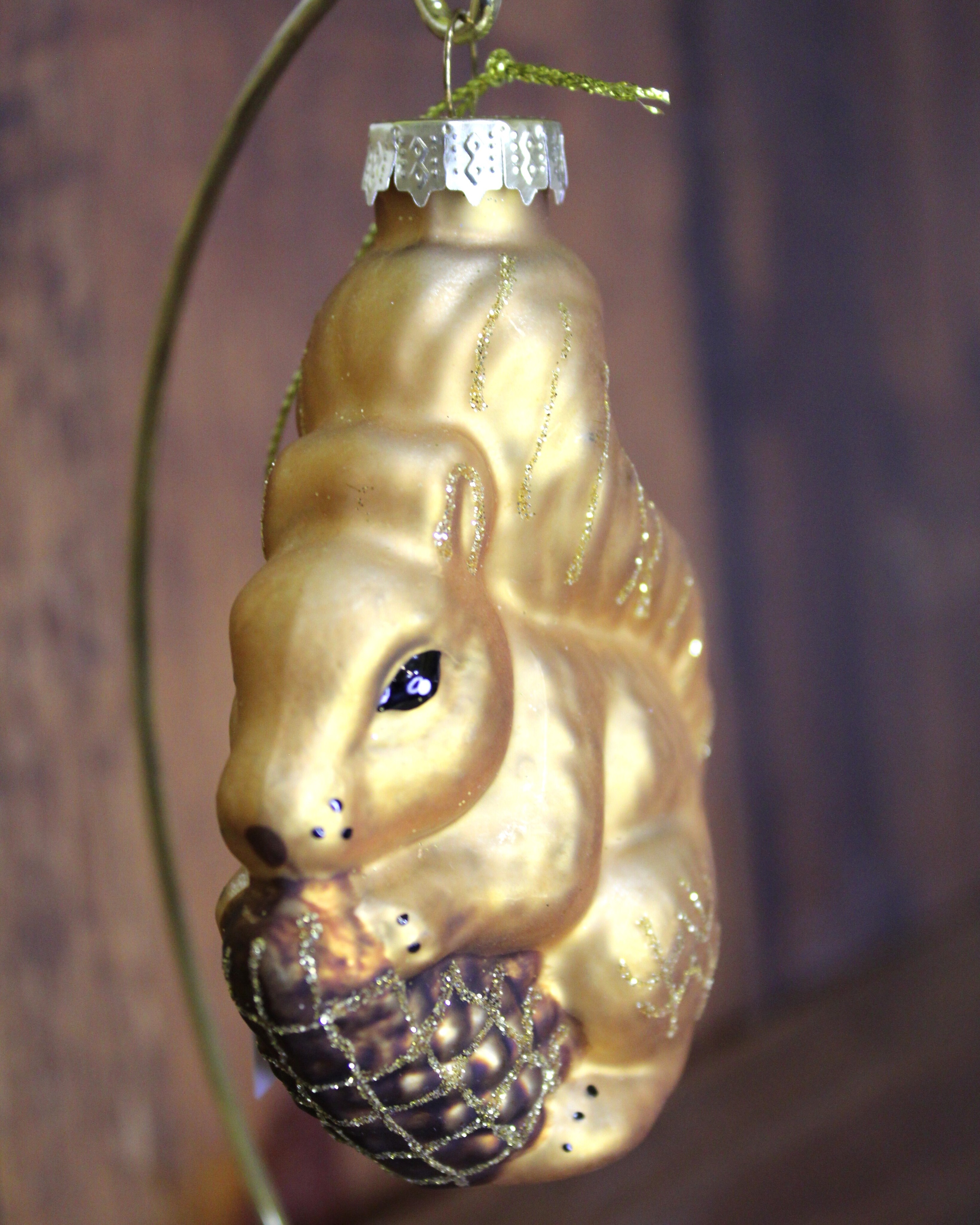 Новогоднее украшение «Белочка» — это очаровательная стеклянная елочная игрушка, воплощающая классику праздничного декора с образом лесной белочки, уютно сидящей с шишкой в лапках, словно хранительница зимних секретов. Её поверхность украшена сверкающим золотым глиттером, который переливается в свете огней, добавляя нотку роскоши и волшебства, идеально гармонируя с традиционными новогодними мотивами.