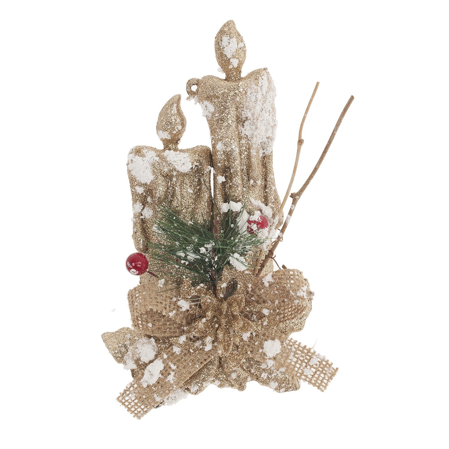 Украшение "Свечи" золотого цвета с искристым напылением и искусственной хвойной веточкой. Глиттер придает украшению яркости и блеска. Великолепно гармонирует с любым убранством новогодней ели.